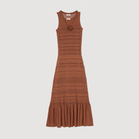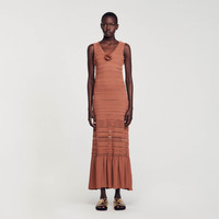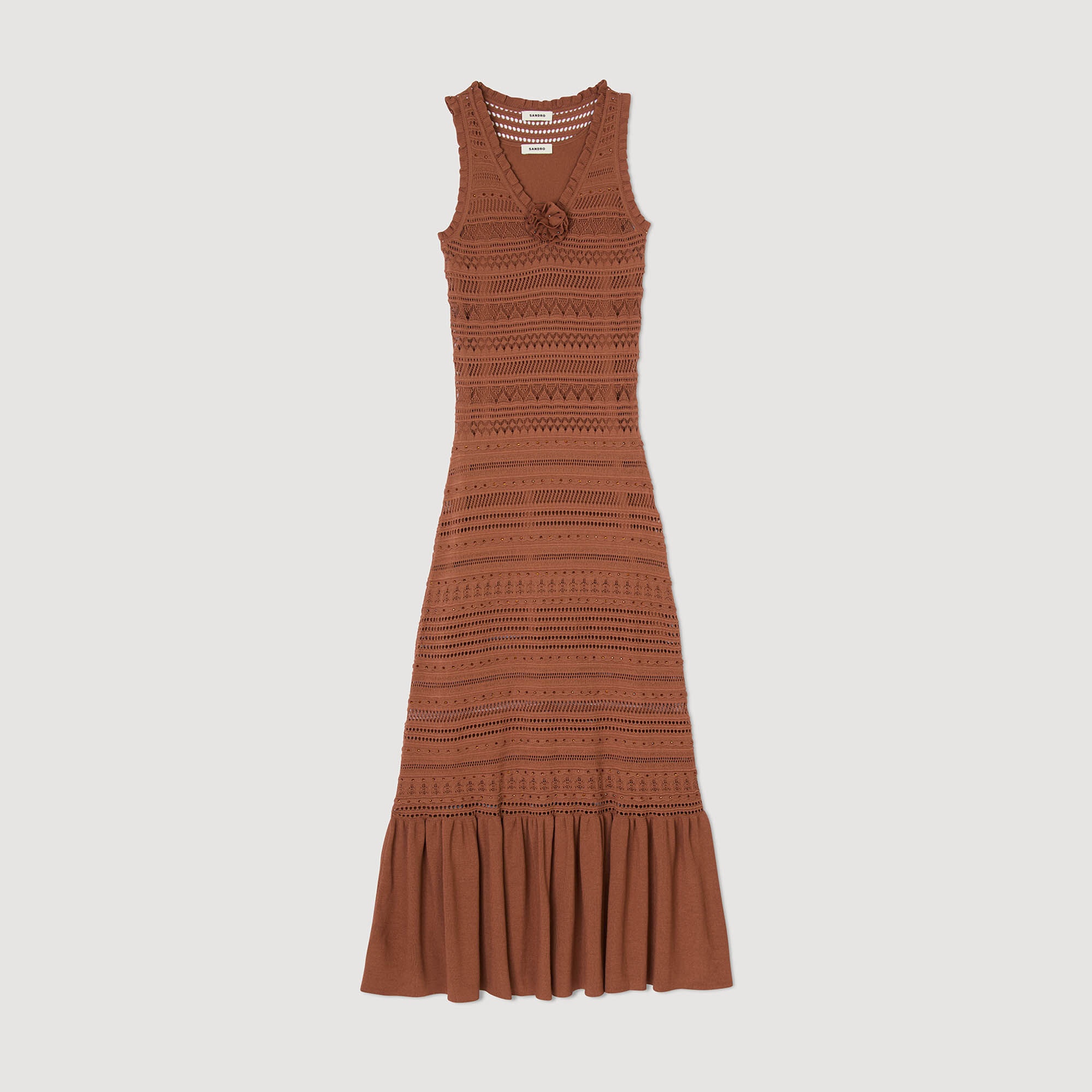 Sleeveless maxi dress in decorative knit with tone-on-tone rhinestones, featuring a V-neckline with an appliqué flower and a ruffle at the bottom of the skirt. Sandro Women's knit maxi dress Tone-on-tone all-over rhinestones Sleeveless V-neck with flower appliqué Ruffled details Ruffles at bottom of skirt The model is 180 cm / 5'11 tall and wears a size 36 FR / 8 UK COMPOSITION Main fabric: 63% viscose, 37% polyamide Lining: 63% viscose, 37% polyamide Ornaments: 63% viscose, 37% polyamide Reference: SFPRO03547_G023