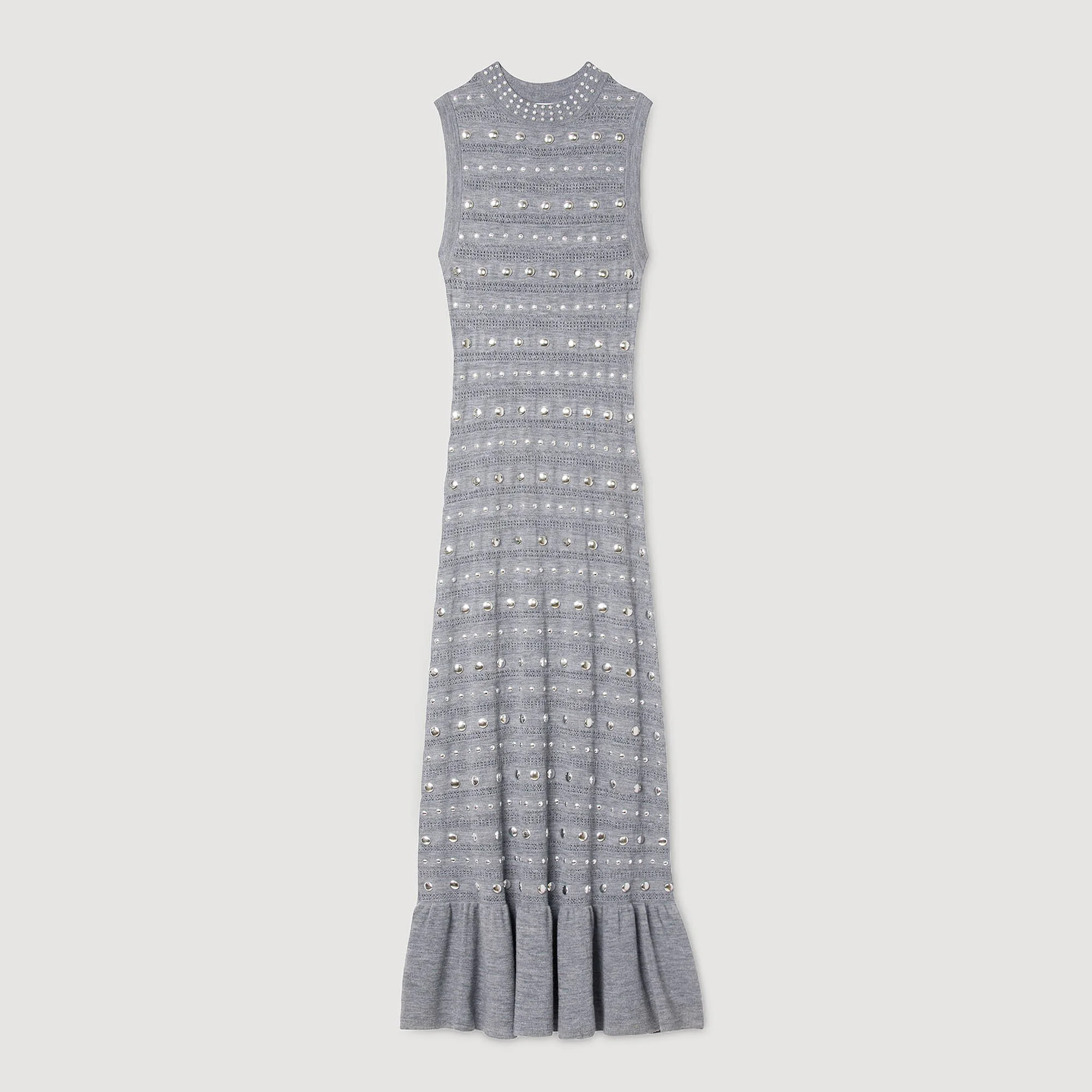Sleeveless maxi dress in stretch pointelle knit with round neck, ruffled hem and silver metal studs. - Sandro Women's stretch knit maxi dress - Round neck - Sleeveless - Semi-sheer - Ruffled hem - Silver metal rivets - Designed for a slim fit Reference: SFPRO03983_24 COMPOSITION & CARE Composition - Main fabric: 67% wool, 18% polyamide, 12% polyester, 3% elastane - Ruffle: 85% wool, 15% polyester Care advice - Hand wash - Do not bleach - Do not tumble dry - Iron at a maximum temperature of 110°C without steam - F - Professional dry clean, with hydrocarbon solvent, normal treatment