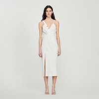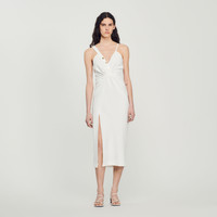 Long dress with an asymmetrical V-shaped neckline featuring one wide strap and one narrow strap, a button placket with branded gold buttons, and a front slit. Sandro Women's long dress V-shaped neckline Asymmetrical straps Gathered effect Gold-tone buttons Fitted, figure-hugging cut Front slit The model is 5'9" tall and wears a size 36 FR / 4 US Reference : SFPRO03082 MATERIALS Main fabric: 100% polyester Bias binding: 100% polyester