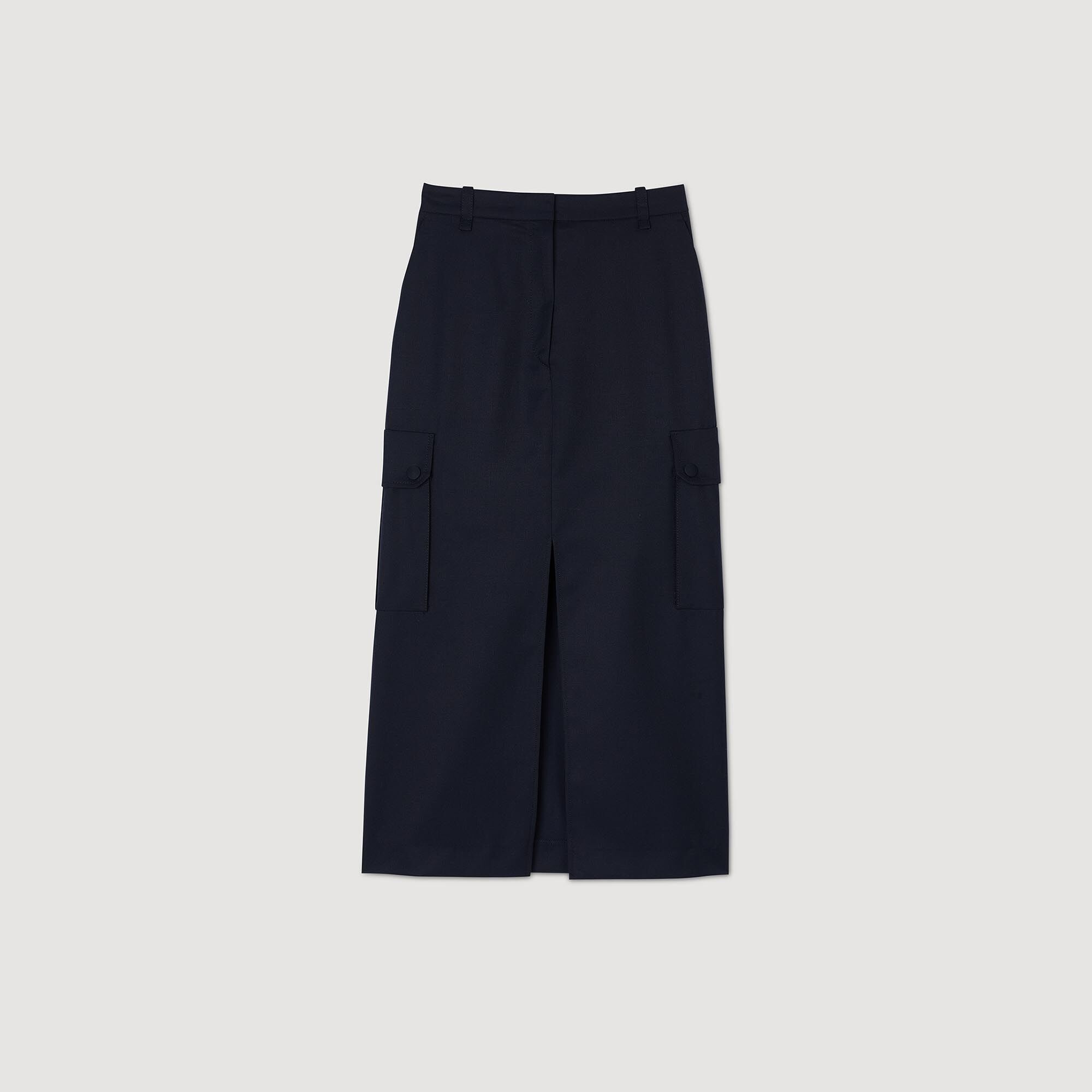 Cargo-style long skirt with large press-stud side pockets and front slit. Sandro Women's maxi cargo skirt Large side pockets Belt loops Front slit The model is 178 cm / 5'10 tall and wears a size 36 FR / 4 US COMPOSITION Main fabric: 55% polyester, 45% virgin wool Pocket lining: 100% cotton Reference: SFPJU01289_44
