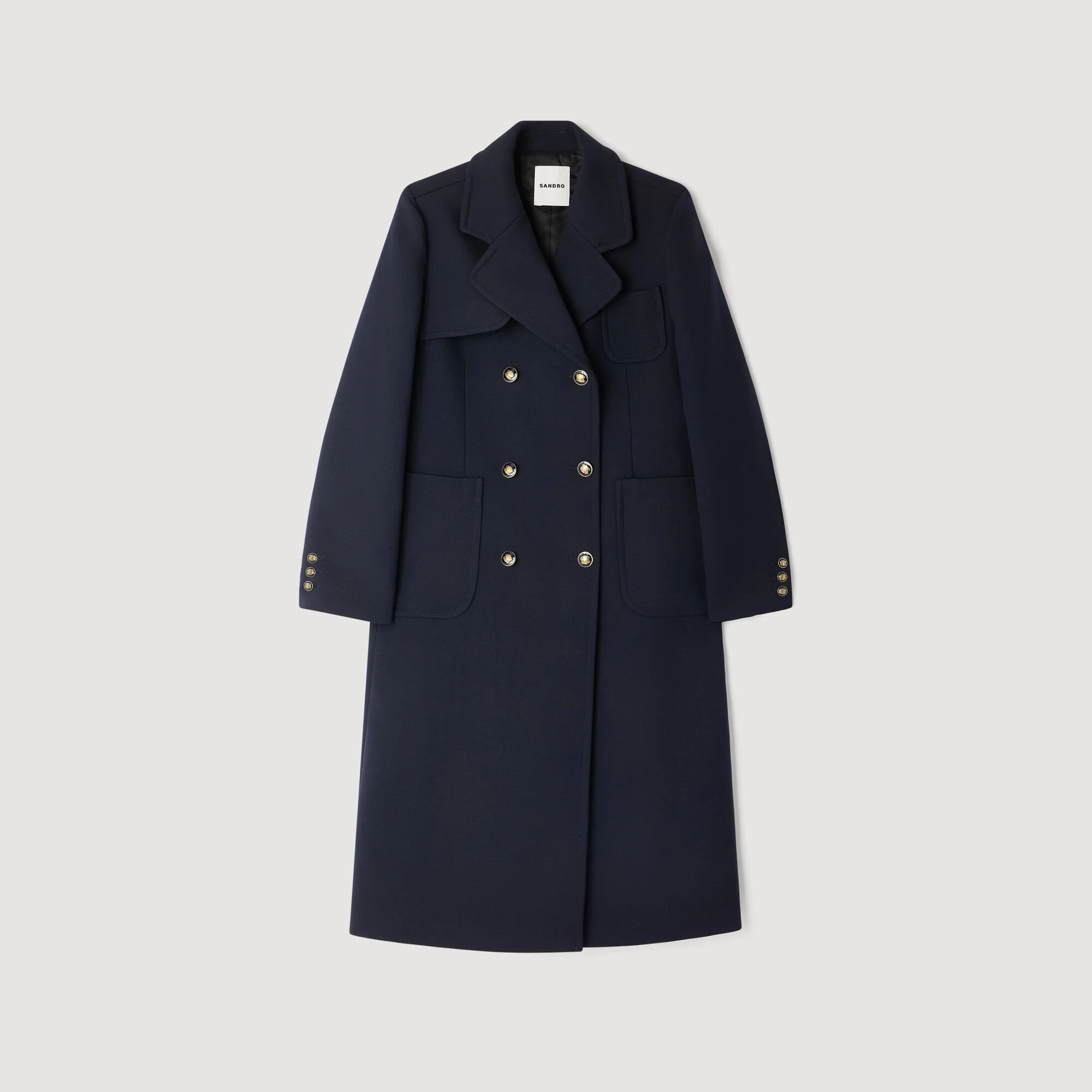 Long coat with long sleeves, featuring a double-breasted fastening and patch pockets. - Sandro Women's long double-breasted coat - Large lapel collar - Long sleeves - Pockets - True to size Reference: SFPOU00777_44 COMPOSITION & CARE Composition - Main material: 54% polyester, 44% virgin wool, 2% elastane - Lining: 100% viscose - Pocket lining: 100% cotton Care advice - Do not wash - Do not bleach - Do not tumble dry - Iron at a maximum temperature of 110°C without steam - F/ - Professional dry clean, with hydrocarbon solvent, gentle treatment