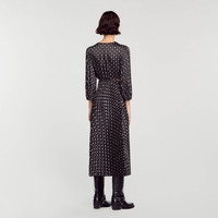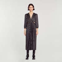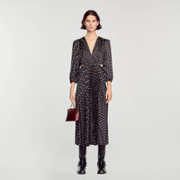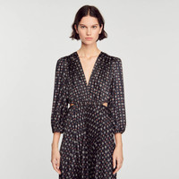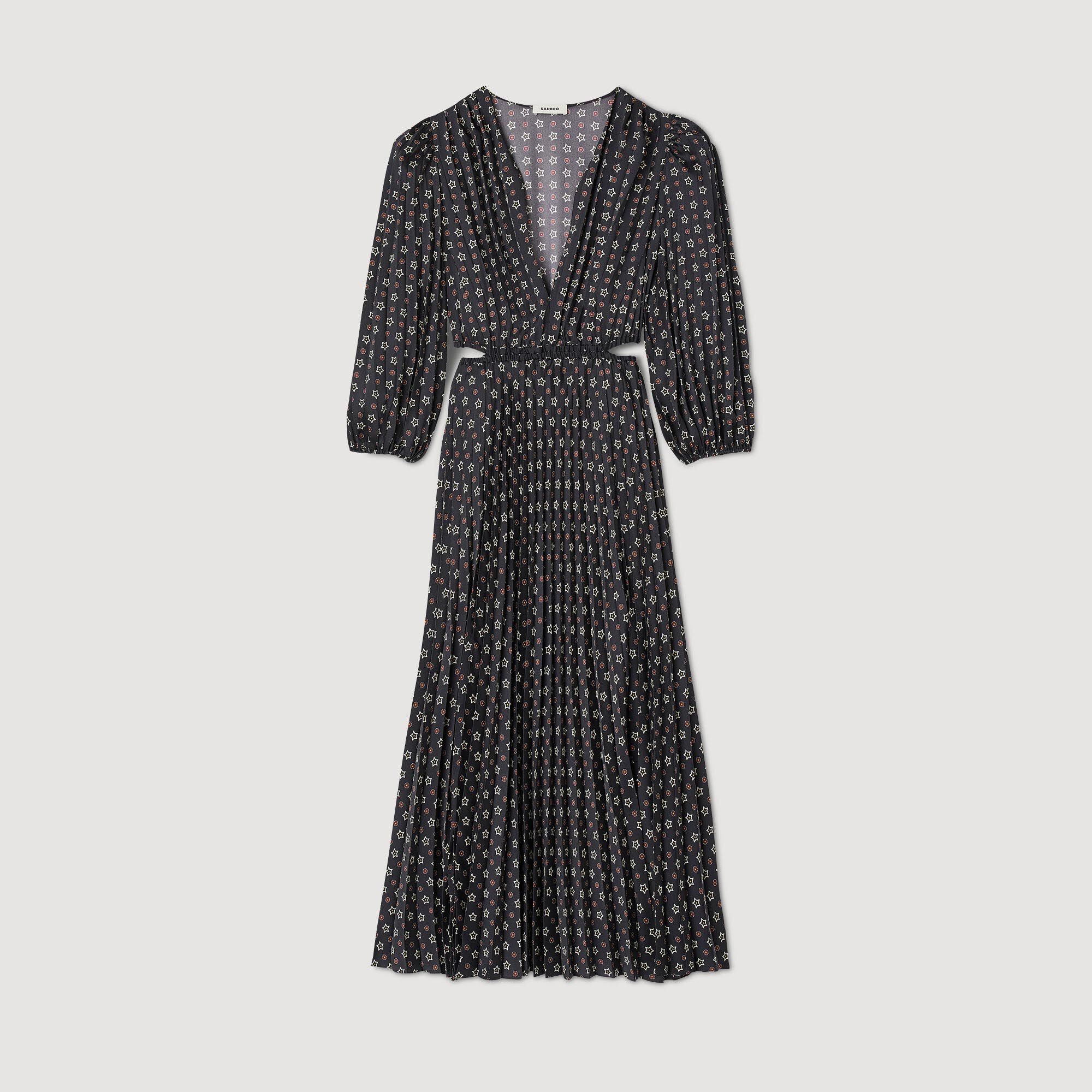 Long pleated dress with a "mini stars" print, long voluminous sleeves with gathered cuffs, an elasticated waist with cut-outs at the sides, and a flared skirt. Sandro Women's long satin dress Low neckline Long sleeves with gathered cuffs Pleated skirt Elasticated waist Openwork panel on the sides The model is 5'9" tall and wears a size 36 FR / 4 US This item's main material is at least 50% recycled. Recycling reduces the environmental impact by limiting the use of virgin materials. The model is 178 cm / 5'10 tall and wears a size 36 FR / 8 UK COMPOSITION Main fabric: 100% polyester Reference: SFPRO03215_B169