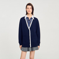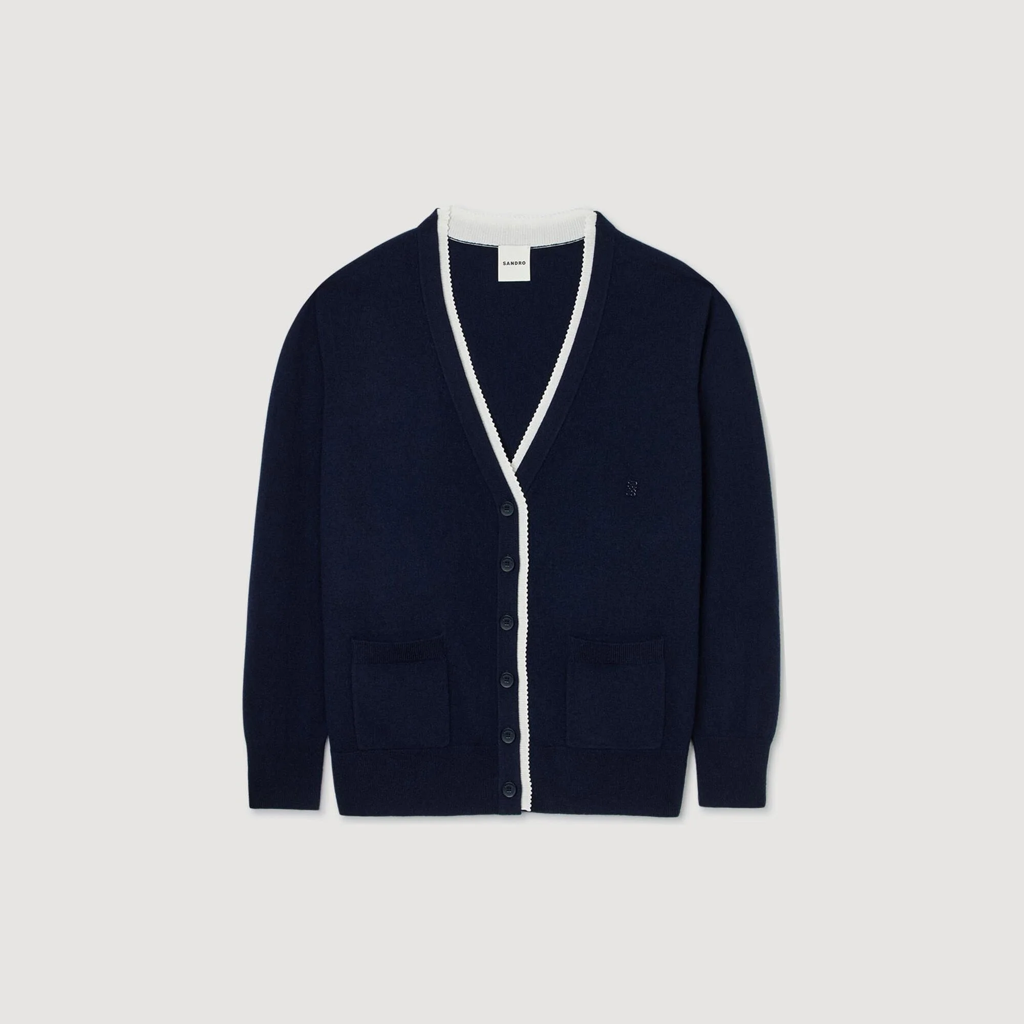 Long wool and cashmere cardigan with contrasting band, V-neck, long sleeves and button fastening. - Sandro Women's plain wool and cashmere cardigan - V-neck - Long sleeves - Button fastening - Fine knit - Patch pockets on hips - Ribbed cuffs and waist - True to size Reference: SFPCA01296_44 COMPOSITION & CARE Composition - Main fabric: 91% wool, 9% cashmere - Band: 72% viscose, 28% polyamide - Rib: 88% wool, 8% cashmere, 3% polyamide, 1% elastane Care advice - Hand wash - Do not bleach - Do not tumble dry - Iron at a maximum temperature of 110°C without steam - F - Professional dry clean, with hydrocarbon solvent, normal treatment