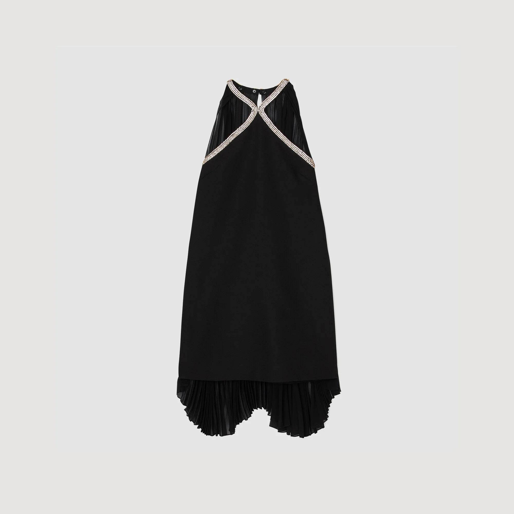 Mini dress with a rhinestone-embellished cape, featuring a V-neck and back zip fastening. - Sandro Women's mini dress - V-neck - Removable pleated cape - Back zip fastening - Lined - True to size Reference: SFPRO04344_20 COMPOSITION & CARE Composition - Lining: 100% polyester - Buttons: 100% nacre - Body: 91% polyester, 9% elastane - Secondary material: 100% polyester Care advice - Do not wash - Do not bleach - Do not tumble dry - Iron at a maximum temperature of 110°C without steam - F/ - Professional dry clean, with hydrocarbon solvent, gentle treatment