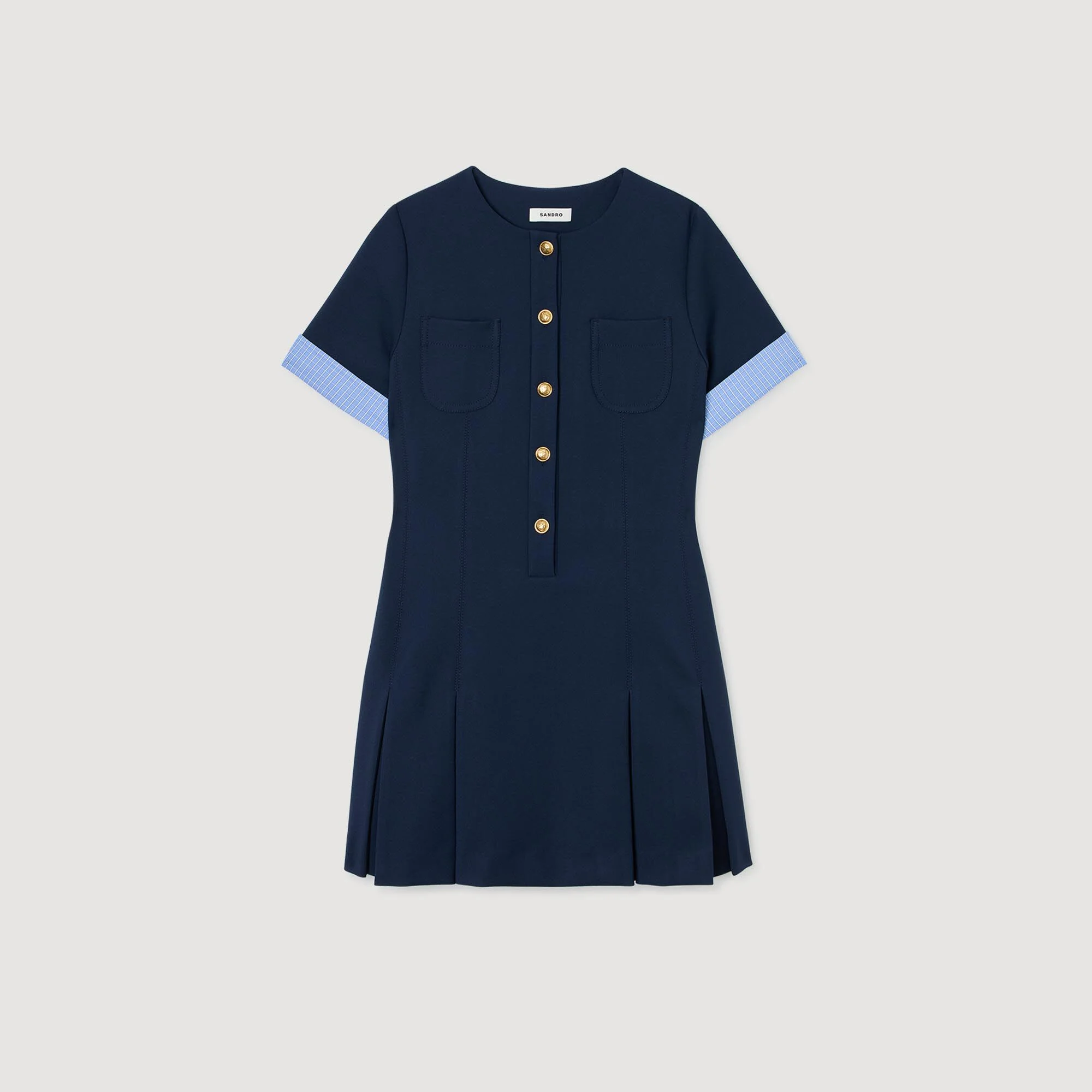 Mini pleated check dress with a round neck, short sleeves with contrasting inserts and a button placket. - Sandro Women's mini check dress - Round neck - Button fastening - Short sleeves with contrasting insert - Patch pockets with topstitching at the chest - True to size Reference: SFPRO04414_44 COMPOSITION & CARE Composition - Main material: 91% polyester, 9% elastane - Lining: 100% polyester - Secondary material: 100% cotton Care advice - Do not wash - Do not bleach - Do not tumble dry - Iron at a maximum temperature of 110°C without steam - F/ - Professional dry clean, with hydrocarbon solvent, gentle treatment