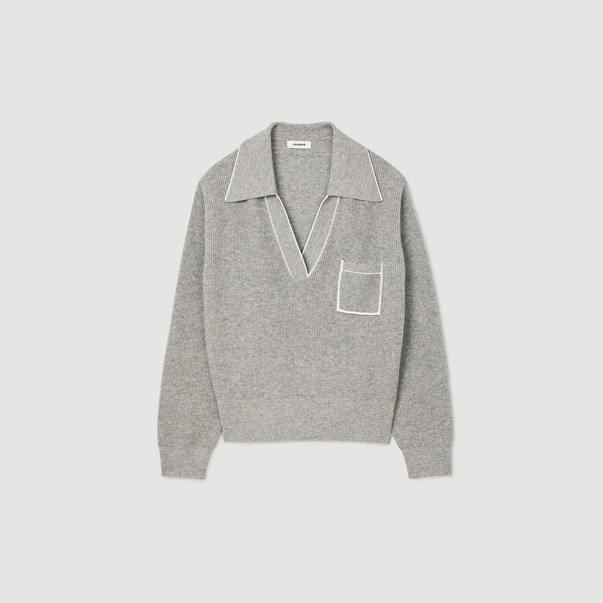 Long-sleeved knit sweater with open V-neck polo collar with contrast piping and patch pocket at chest. - Sandro Women's knit sweater - Open polo collar neck - Long sleeves - Patch pocket on chest - True to size Reference: SFPPU02376_24 COMPOSITION & CARE Composition - Main fabric: 71% wool, 29% cashmere - Collar: 63% wool, 26% cashmere, 10% polyamide, 1% elastane - Bias binding: 62% viscose, 38% polyamide - Rib: 67% wool, 26% cashmere, 6% polyamide, 1% elastane Care advice - Hand wash - Do not bleach - Do not tumble dry - Iron at a maximum temperature of 110°C without steam - F - Professional dry clean, with hydrocarbon solvent, normal treatment