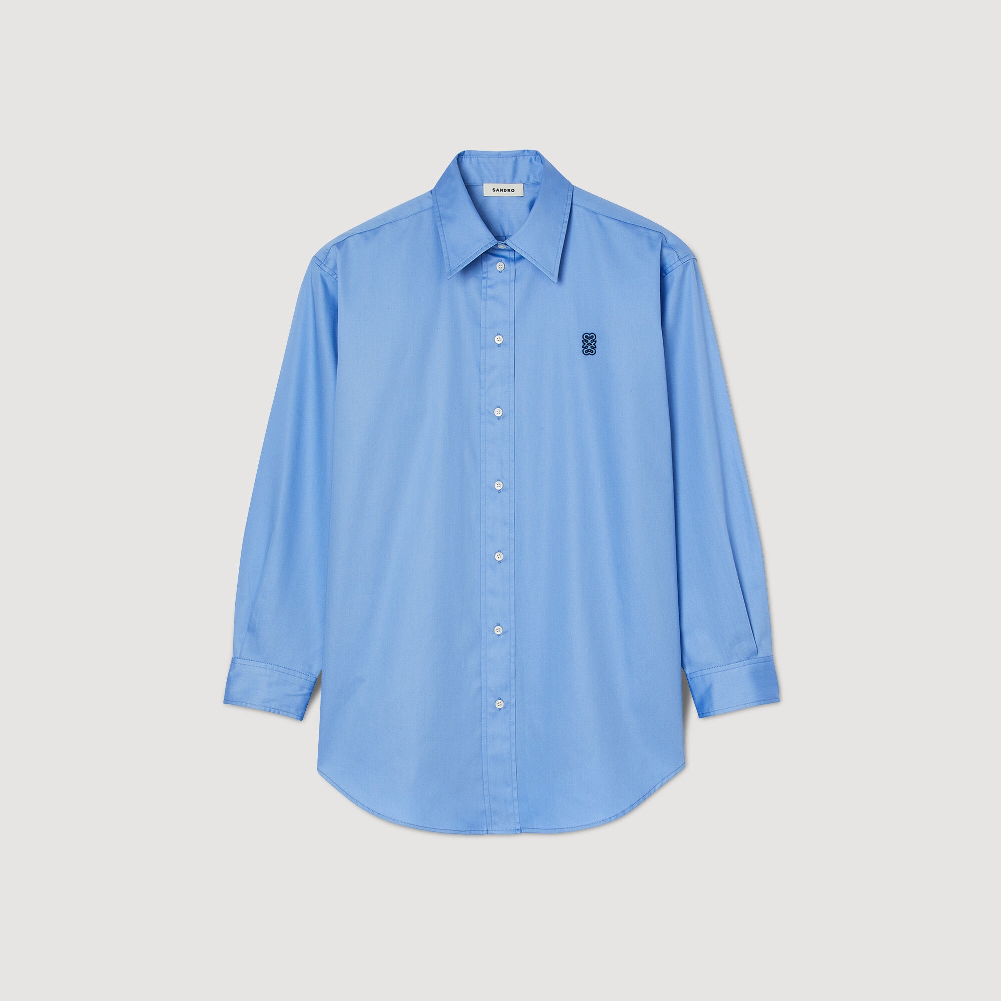 Oversized cotton shirt with long sleeves, button fastening and embellished with contrasting double S embroidery on the chest. Sandro Women's oversized cotton shirt Shirt collar Long sleeves Button fastening Flat pleats on the back Asymmetric hem Embroidered double S on chest The model is 177 cm / 5'9" tall and wears a size 1 FR / 8 UK The model is 178 cm / 5'10 tall and wears a size 1 FR / 8 UK COMPOSITION Main fabric: 100% cotton Buttons: 100% nacre Reference: SFPCM00966_47