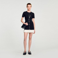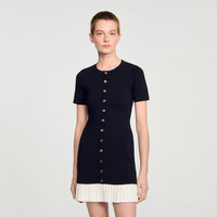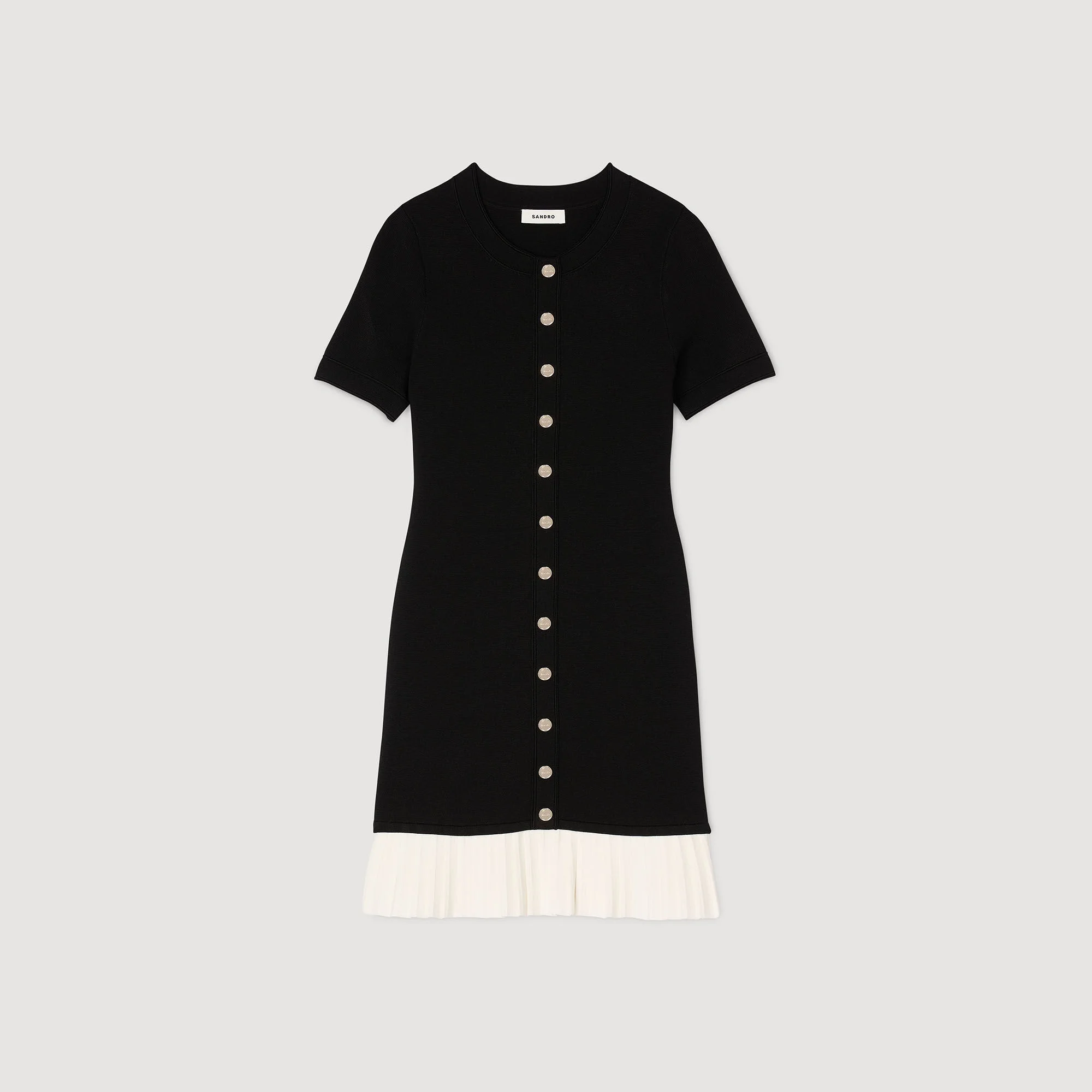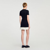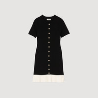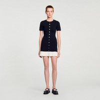 Short-sleeved knit dress featuring a round neck, press-stud placket and a contrasting ruffled flounce on the bottom of the skirt. - Sandro Women's knit mini dress - Round neck - Short sleeves - Button placket with decorative press studs - Contrast ruffle at bottom of skirt - Designed for a slim-fit Reference: SFPRO04051_B275 COMPOSITION & CARE Composition - Main fabric: 53% viscose, 45% polyamide, 2% elastane - Tab: 55% polyamide, 43% viscose, 2% elastane - Wrist: 55% polyamide, 43% viscose, 2% elastane - Ruffle: 53% viscose, 44% polyamide, 3% elastane - Collar: 55% polyamide, 43% viscose, 2% elastane Care advice - Hand wash - Do not bleach - Do not tumble dry - Iron at a maximum temperature of 110°C without steam - F - Professional dry clean, with hydrocarbon solvent, normal treatment
