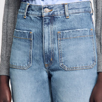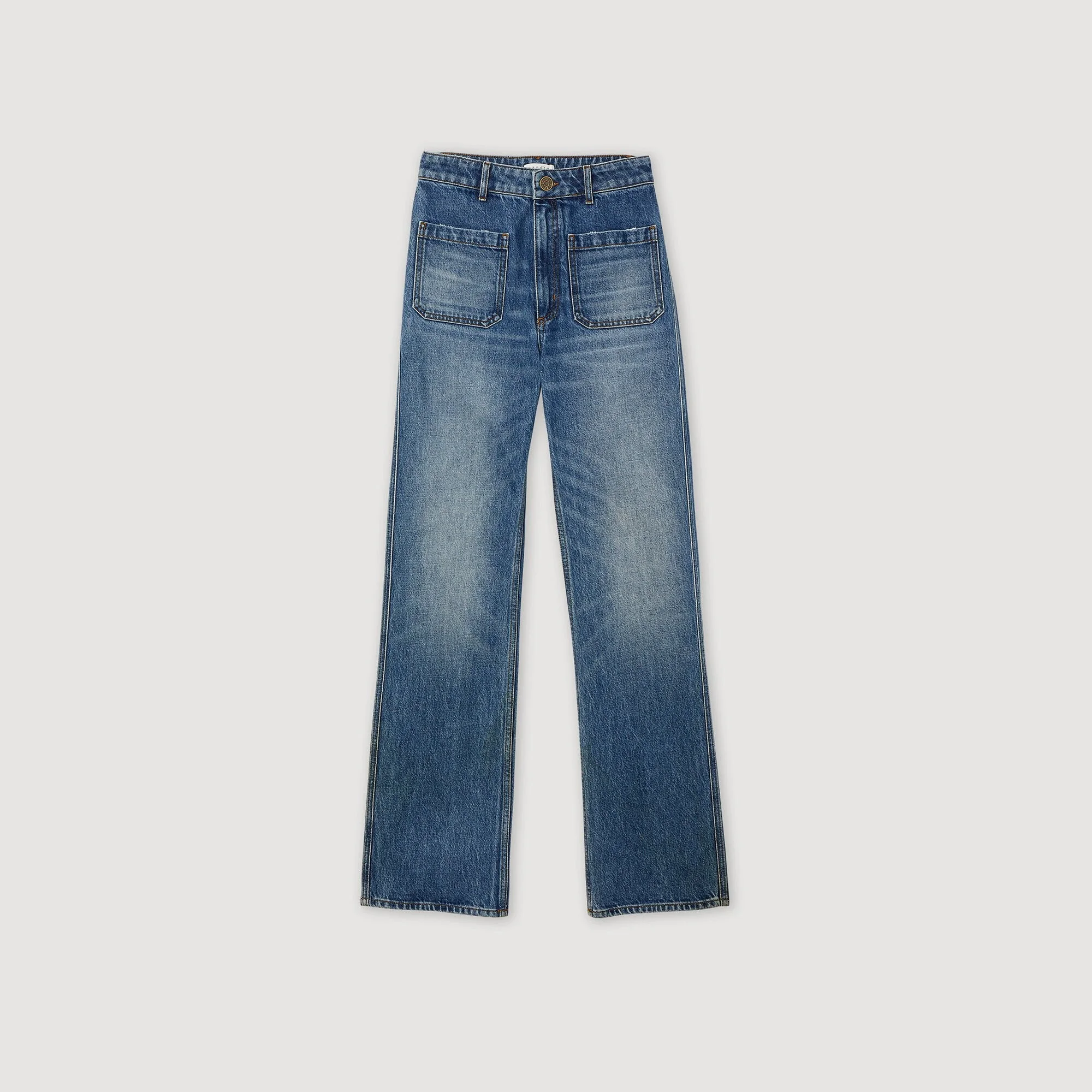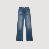 Flared faded denim jeans with patch pockets on the front. • Sandro Women's flared jeans • Patch pockets • Faded fabric • Zip and button fastening This denim was treated using a process that reduces water consumption by 95% and significantly limits the use of energy and chemicals compared to traditional treatment techniques. Sandro is committed to ever more responsible fashion. As part of our traceability project in partnership with Fairly Made, we openly reveal information on the origin, manufacture and environmental impact of our clothing. All the stages for making and transforming these jeans have been carried out in Turkey, using cotton from fields farmed locally. Reference: SFPJE00460_4785 COMPOSITION & CARE Composition - Main fabric: 100% cotton Care advice - Gentle cycle 30° - Do not bleach - Do not tumble dry - Iron at a maximum temperature of 110°C without steam - F/ - Professional dry clean, with hydrocarbon solvent, gentle treatment
