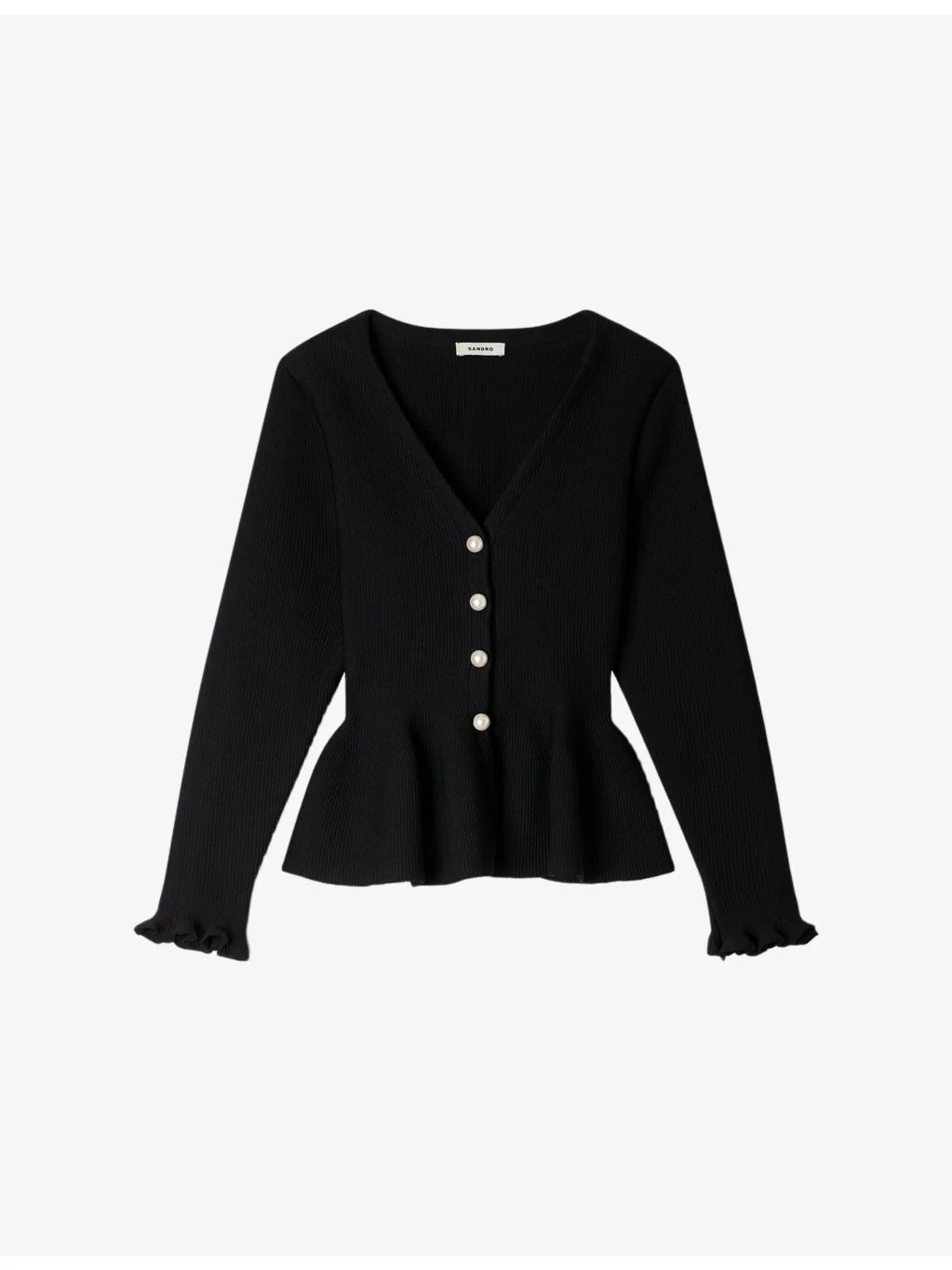PRODUCT DETAILS - Sandro knitted cardigan - 63% polyamide, 37% viscose - Exposed button fastening at front - Slim fit, V-neck, long sleeves, peplum hem - Hand wash - True to size - Midweight, slight stretch Ref: R04578704
