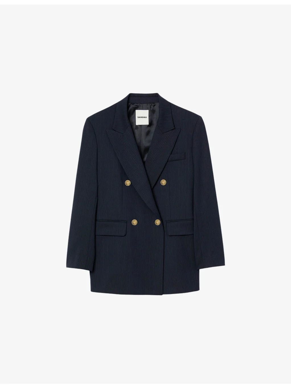 PRODUCT DETAILS - Sandro wool-blend blazer - 55% wool, 41% polyester, 4% elastane - Button fastening - Double breasted, peak lapels, long sleeves, pin stripe, pockets at front, lined - Dry clean - True to size - Midweight, non-stretch Ref: R04512062
