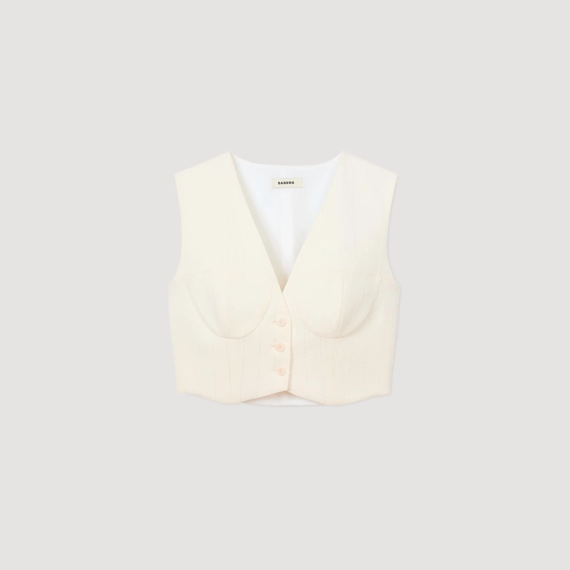 Striped cropped jacket with tone-on-tone sequins and corset-style tailoring, featuring a button placket and V-neckline. - Sandro Women's cropped jacket - Sequin stripes - Sleeveless - Corset tailoring - Buttons down the front - Designed for a slim, cropped fit This jacket matches the , the and the Reference: SFPTO00746_11 COMPOSITION & CARE Composition - Main fabric: 95% viscose, 3% polyamide, 2% polyester - Lining: 100% cotton Care advice - Do not wash - Do not bleach - Do not tumble dry - Iron at a maximum temperature of 110°C without steam - F/ - Professional dry clean, with hydrocarbon solvent, gentle treatment