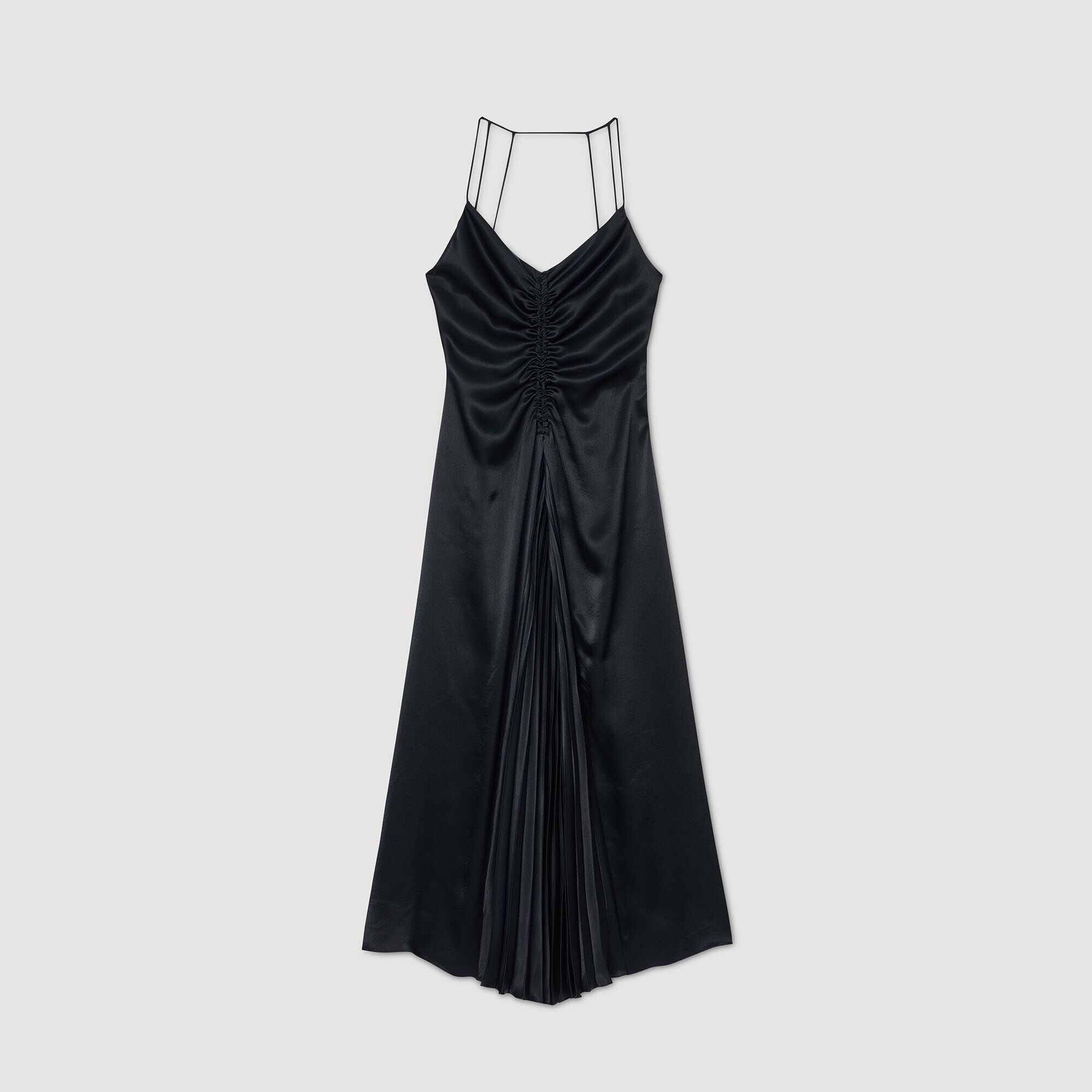 Long satin-effect dress with spaghetti straps, asymmetrical skirt with pleated front and ruched plunging neckline with drawstrings. Sandro Women's long satin-effect dress Spaghetti straps V-neckline Curved back Ruched front Drawstrings with gathers Unlined The model is 177 cm / 5'10 tall and wears a size 36 FR / 4 US COMPOSITION Main fabric: 100% polyester Reference: SFPRO03938_44