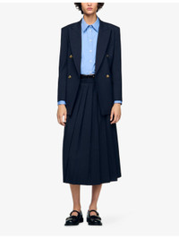 PRODUCT DETAILS - Sandro stretch wool-blend skirt - 55% wool, 41% polyester, 4% elastane - Exposed button fastening at front - Regular fit, contrast waistband, buttons at the side, pleated, all-over stripes - Hand wash - True to size - Model is 5ft 10in/1.78m and wears a size UK 8 - Midweight, slight stretch Ref: R04501127