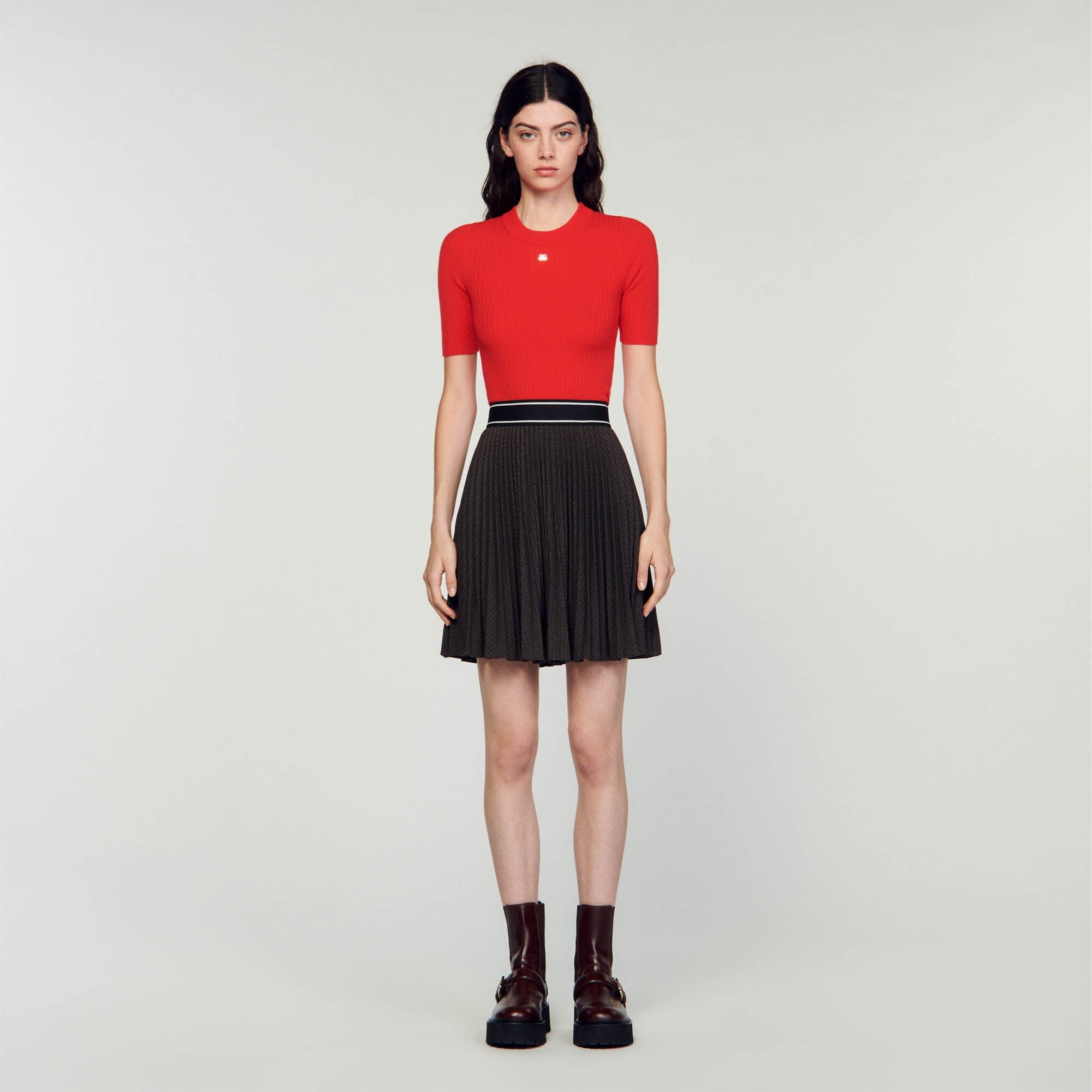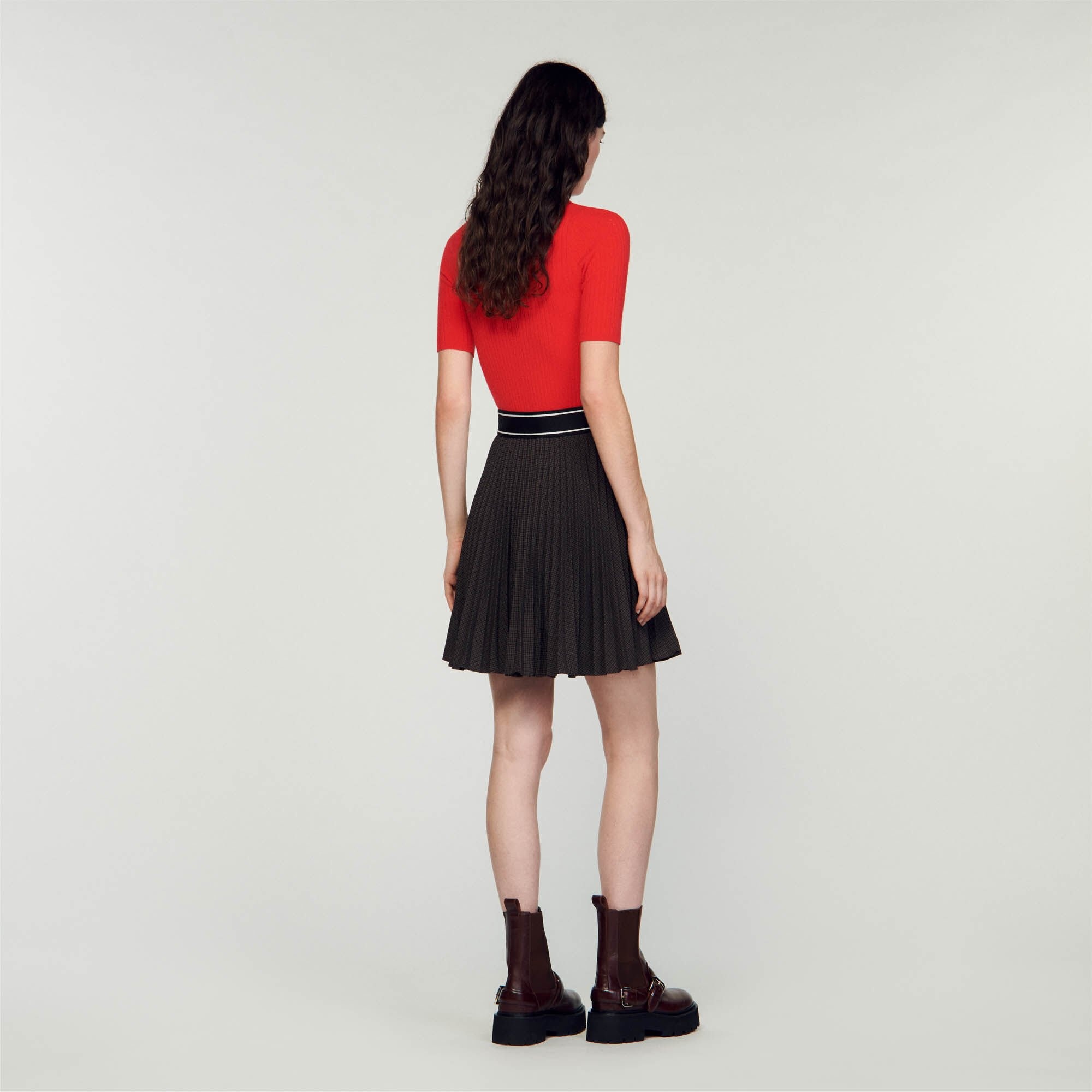 Short pleated skirt in a check pattern, with an elasticated waistband with contrasting trim. Sandro Women's short skirt Pleated Elasticated waistband with contrasting trim Checked This model has been manufactured using a minimum of 50% recycled materials for the main fabric. Recycling reduces the impact on the environment by cutting down on the use of virgin materials. The model is 177 cm / 5'9" tall and wears a size 36 FR / 4 US The model is 178 cm / 5'10 tall and wears a size 36 FR / 8 UK COMPOSITION Main fabric: 63% polyester, 33% viscose, 4% elastane Reference: SFPJU00941_G023