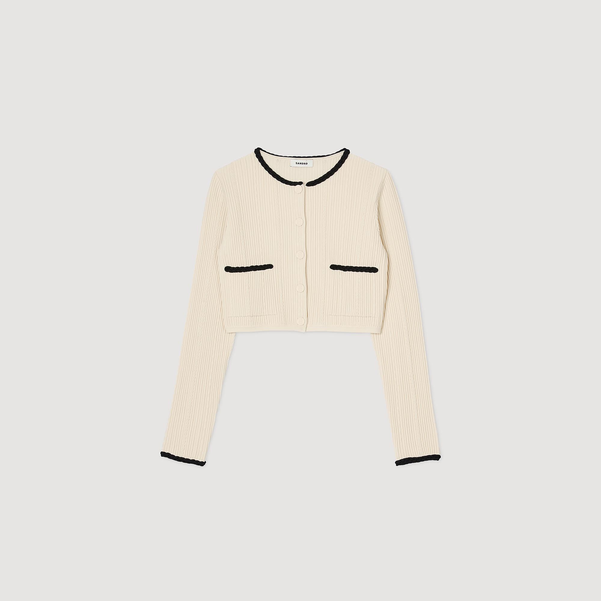 Pointelle knit cropped cardigan featuring a round neck, long sleeves and a button fastening with a covered placket adorned with contrasting braided trim. Sandro Women's knit cropped cardigan Round neck Long sleeves Braided contrast trim 2 pockets This cardigan matches the dress The model is 180 cm / 5'11 tall and wears a size 1 FR / 4 US COMPOSITION Main fabric: 50% viscose, 48% polyamide, 2% elastane Braid: 65% viscose, 35% polyamide Band: 65% viscose, 35% polyamide Reference: SFPCA01092_11