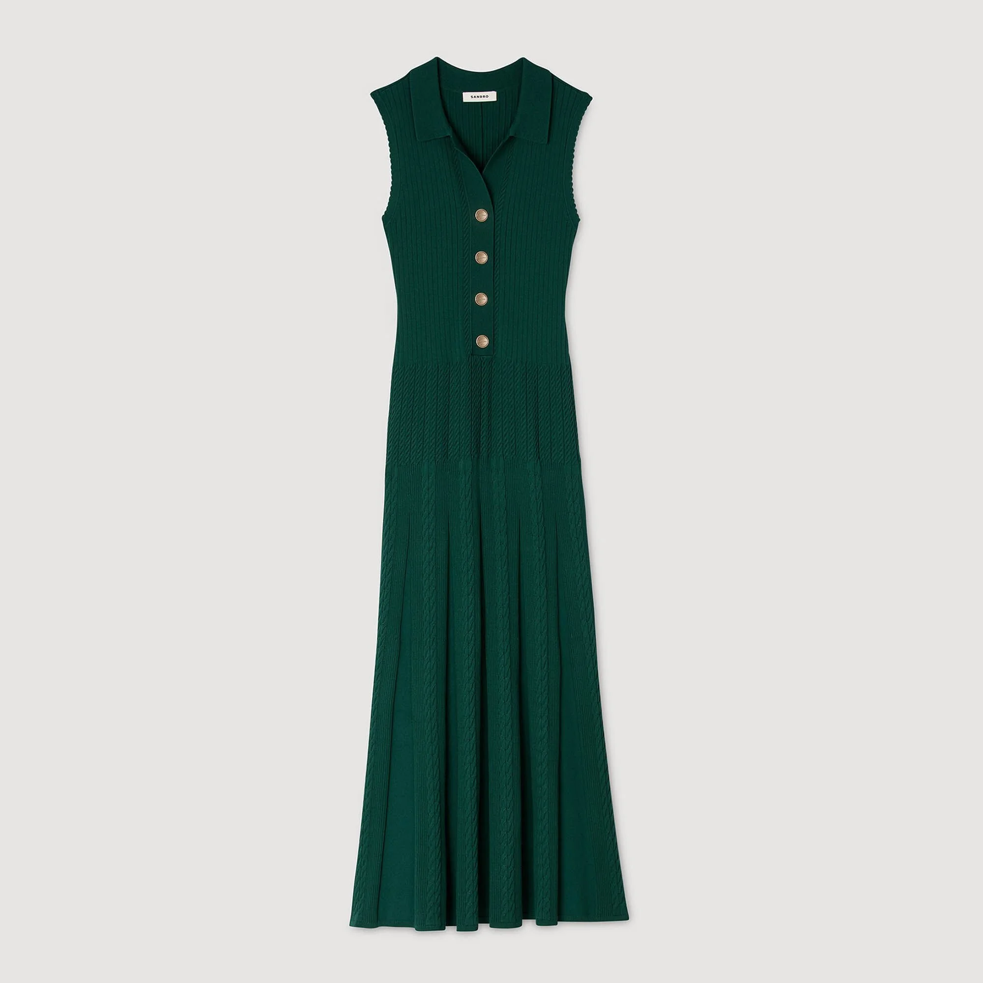 Sleeveless maxi knit dress with a buttoned polo collar, V-neckline, and front button fastening. - Sandro Women's maxi knit dress - Polo collar - V-neckline - Front button fastening - Sleeveless - Designed for a flared fit Reference: SFPRO04437_8011 COMPOSITION & CARE Composition - Main fabric: 52% viscose, 46% polyamide, 2% elastane - Band: 54% viscose, 44% polyamide, 2% elastane Care advice - Hand wash - Do not bleach - Do not tumble dry - Iron at a maximum temperature of 110°C without steam - F - Professional dry clean, with hydrocarbon solvent, normal treatment