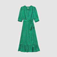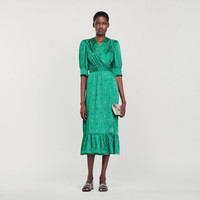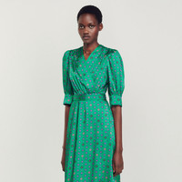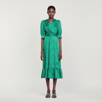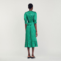 Mid-length satin dress embellished with a star scarf print, with an overlap neckline, three-quarter sleeves with gathered cuffs, a tone on tone belt to tie at the back and a ruffle on the lower length. Sandro Women's satin midi dress 3/4-length sleeves Ruffle on the lower length Scarf print The model is 178 cm / 5'10 tall and wears a size 36 FR / 8 UK COMPOSITION Main fabric: 100% silk Buttons: 100% nacre Reference: SFPRO03238_H114