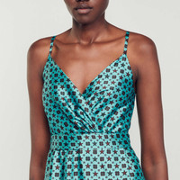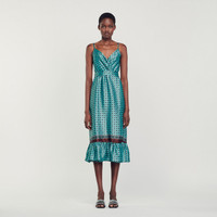 Strappy midi dress with a crossover V-neckline, straps, a ruffle on the lower skirt, and a Stellar Festival print. Sandro Women's flowing satin midi dress Stellar Festival print Narrow straps Draped V-neck Tone-on-tone belt that ties at the back The model is 5'11" tall and wears a size 36 FR / 4 US This item's main material is at least 50% recycled. Recycling reduces the environmental impact by limiting the use of virgin materials. The model is 178 cm / 5'10 tall and wears a size 36 FR / 8 UK COMPOSITION Main fabric: 100% polyester Reference: SFPRO03210_G202