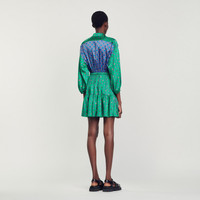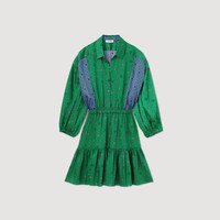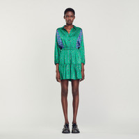 Short shirt dress with a button fastening, embellished with a scarf print, with long sleeves, elasticated cuffs and waist and a ruffle on the lower length. Sandro Women's short dress Button fastening Long sleeves with gathered cuffs Contrasting panels on the front and back This item's main material is at least 50% recycled. Recycling reduces the environmental impact by limiting the use of virgin materials. The model is 5'11" tall and wears a size 36 FR / 4 US Reference : SFPRO03256 MATERIALS Main fabric: 100% polyester SECONDARY FABRIC: 100% polyester Buttons: 100% nacre