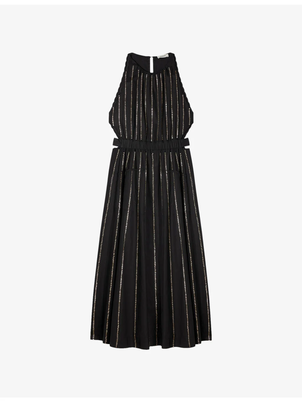 PRODUCT DETAILS - Sandro cotton dress - 100% cotton - Concealed button fastenings at back - Regular fit, high neck, sleeveless, all-over rhinestone embellishment, elasticated straps at the waist, cut-out detail - Hand wash - True to size - Model is 5ft 9in/1.75m and wears a size UK 8 - Midweight, non-stretch Ref: R04598564