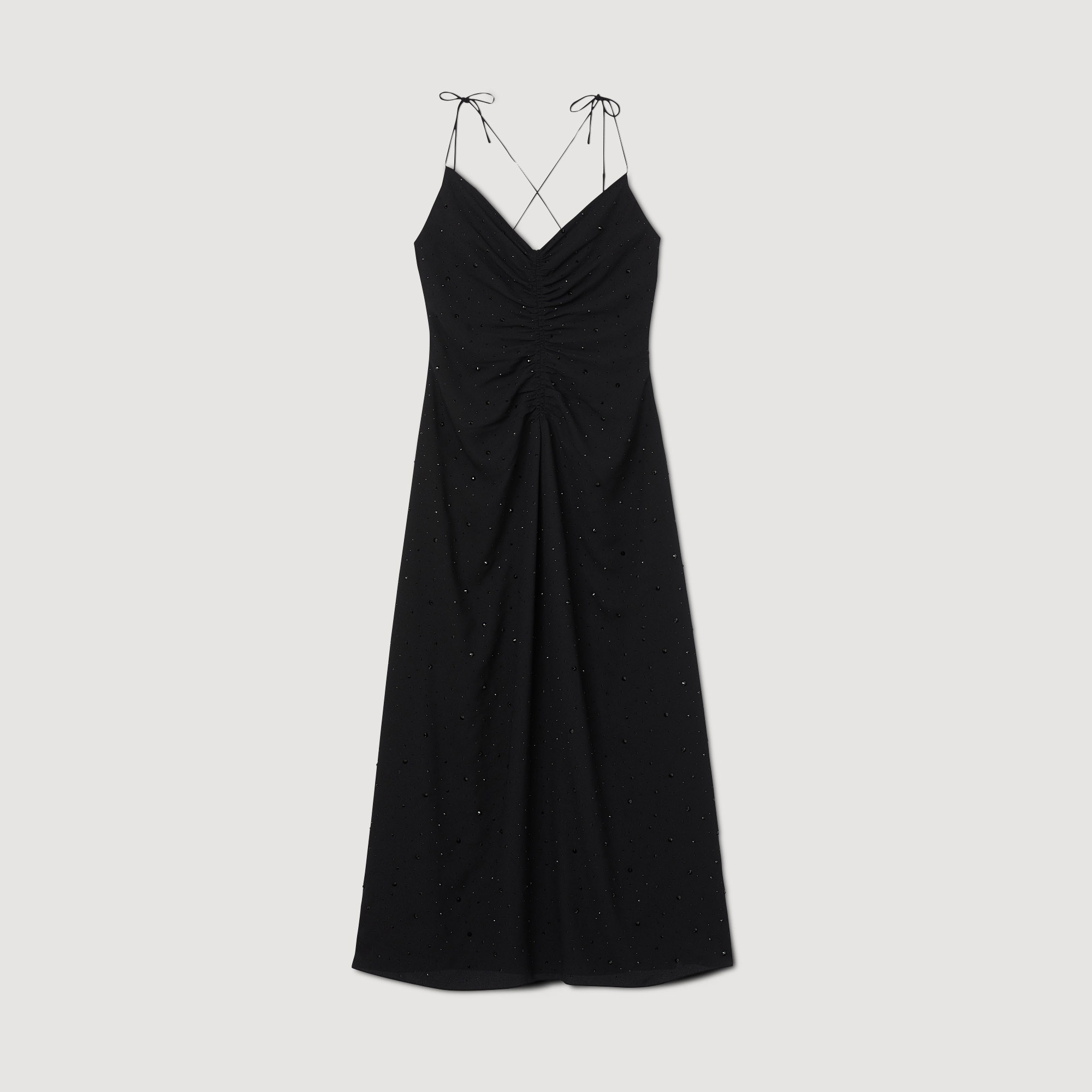 Long dress with a flared skirt, thin crossover straps tied at the back, a gathered plunging neckline, and all-over rhinestones. Sandro Women's long dress Narrow straps Low neckline Gathering The model is 5'11" tall and wears a size 36 FR / 4 US This item's main material is at least 50% recycled. Recycling reduces the environmental impact by limiting the use of virgin materials. Reference : SFPRO03260 MATERIALS Main fabric: 100% polyester Diamante: 100% glass