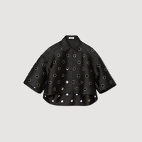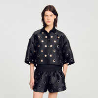 Oversized short-sleeved shirt with a shirt collar and front button fastening, embellished with all-over rhinestone holes and an asymmetric hem. - Sandro Women's oversized shirt - Short sleeves - Shirt collar - Button fastening - Rhinestone holes - Asymmetric hem - Designed for an oversized fit Reference: SFPCM01339_20 COMPOSITION & CARE Composition - Main material: 100% polyester Care advice - Hand wash - Do not bleach - Do not tumble dry - Iron at a maximum temperature of 110°C without steam - F/ - Professional dry clean, with hydrocarbon solvent, gentle treatment