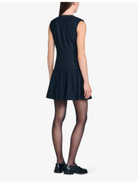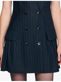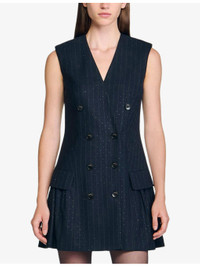 PRODUCT DETAILS - Sandro stretch wool-blend dress - 40% wool, 29% polyester, 28% viscose, 3% elastane - Exposed button fastening at front - Double breasted silhouette, V-neck, sleeveless, all-over rhinestone embellishment and stripes, two flap pockets at the side - Dry clean - True to size - Model is 5ft 9in/1.75m and wears a size UK 8 - Midweight, slight-stretch Ref: R04501164