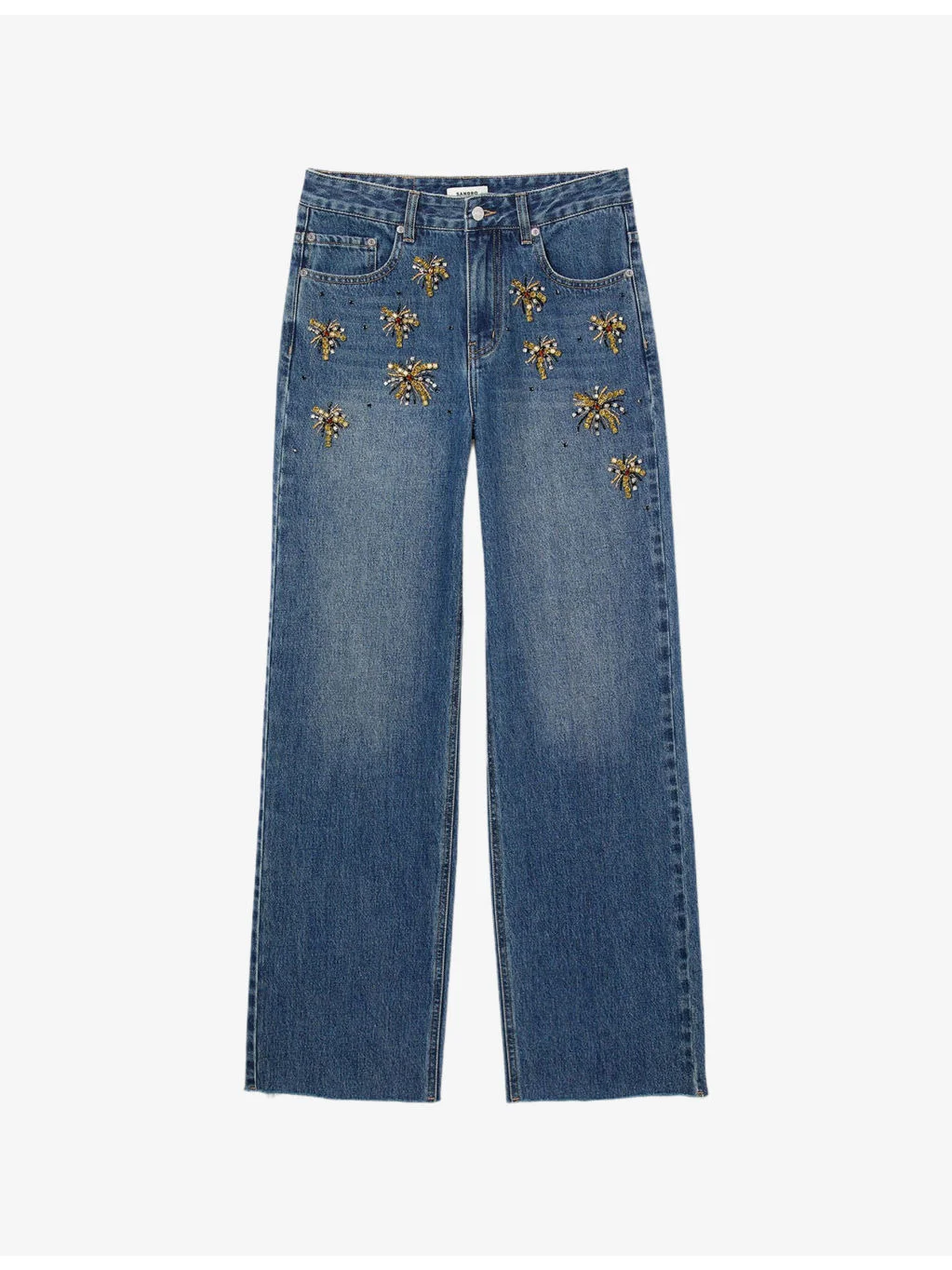 PRODUCT DETAILS - Sandro jeans - 100% cotton - Button and zip-fly fastening - Regular fit, mid-rise, belt loops, five pockets, all-over rhinestone embellishment, straight leg - Hand wash - True to size - Model is 5ft 9in/1.75m and wears a size UK 8 - Midweight, non-stretch Ref: R04501212