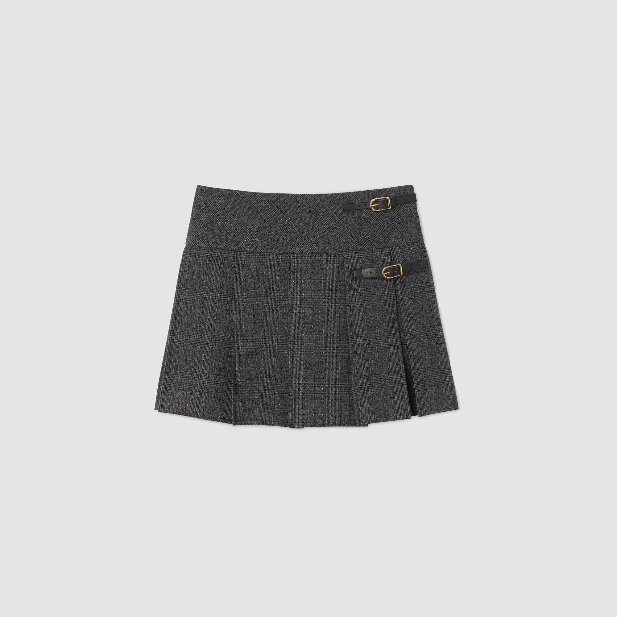 Pleated check skirt embellished with rhinestones and decorative tabs on the side. - Sandro Women's mini pleated skirt - Checks and rhinestones - Decorative tabs - Side zip fastening - Designed for a flared fit Reference: SFPJU01491_B315 COMPOSITION & CARE Composition - Main material: 64% polyester, 33% viscose, 3% elastane - Lining: 100% polyester Care advice - Do not wash - Do not bleach - Do not tumble dry - Iron at a maximum temperature of 110°C without steam - F/ - Professional dry clean, with hydrocarbon solvent, gentle treatment
