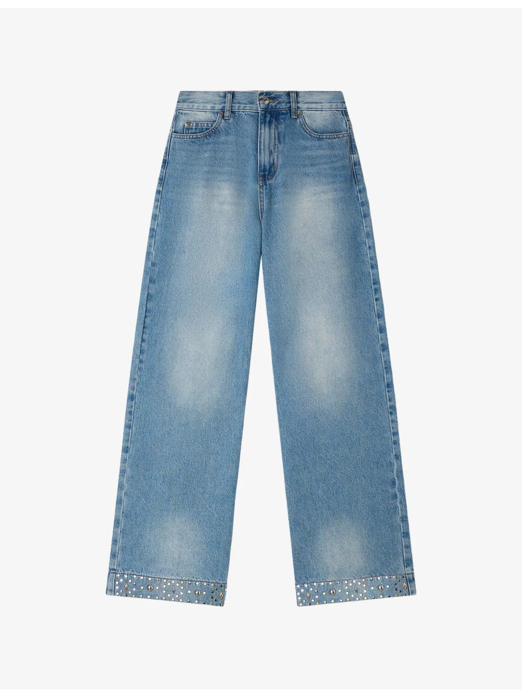 PRODUCT DETAILS - Sandro denim jeans - 100% cotton; pocket lining 80% polyester, 20% cotton - Exposed button and concealed zip-fly fastening at front - Relaxed fit, high-rise, wide leg, structured waistband with belt loops, five pockets, brand patch at back, silver-toned hardware, rhinestone embellishments at cuffs, faded effect, whiskering - Machine wash at 30°C - True to size - Model is 5ft 11in/1.80m and wears a size UK 8 - Midweight, non-stretch Ref: R04578736
