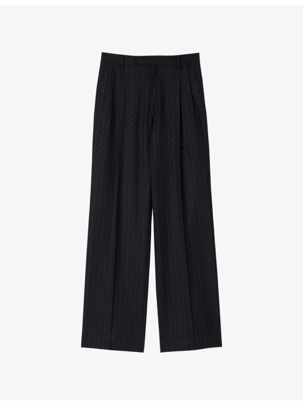 PRODUCT DETAILS - Sandro stretch-wool trousers - 40% wool, 29% polyester, 28% viscose, 3% elastane - Button and zip-fly fastening - Regular fit, mid rise, belt loops, two pockets at the side, rhinestone embellishment, all-over stripe print, wide leg - Dry clean - True to size - Model is 5ft 9in/1.75m and wears a size UK 8 - Lightweight, slight-stretch Ref: R04501148