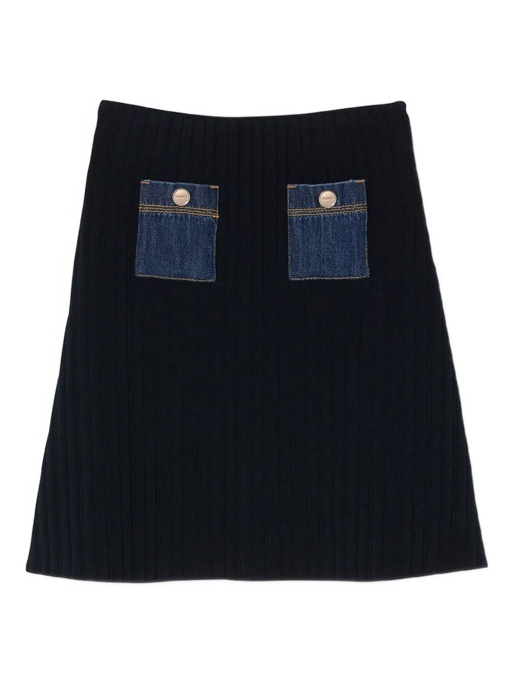 ribbed denim-pocket skirt Highlights - Blue - Ribbed knit - A-line shape - Denim pockets - Button detailing - Straight hemline Imported Composition Outer: Polyester 64%, Viscose 34%, Elastane 2% Lining: Viscose 100%, Cotton 100% Washing instructions Read Manufacturer Guidelines
