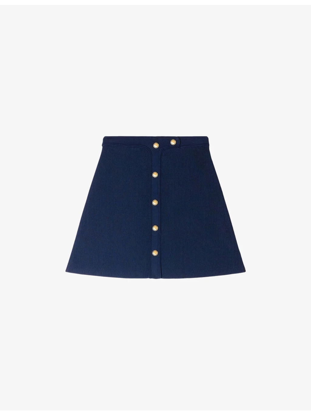 PRODUCT DETAILS - Sandro knitted mini skirt - 61% viscose, 38% polyamide, 1% elastane - Regular fit, high-rise, decorative press studs, ribbed texture - Hand wash - True to size - Model is 5ft 8in / 1.73m and wears a size UK 8 - Lightweight, slight stretch Ref: R04578710