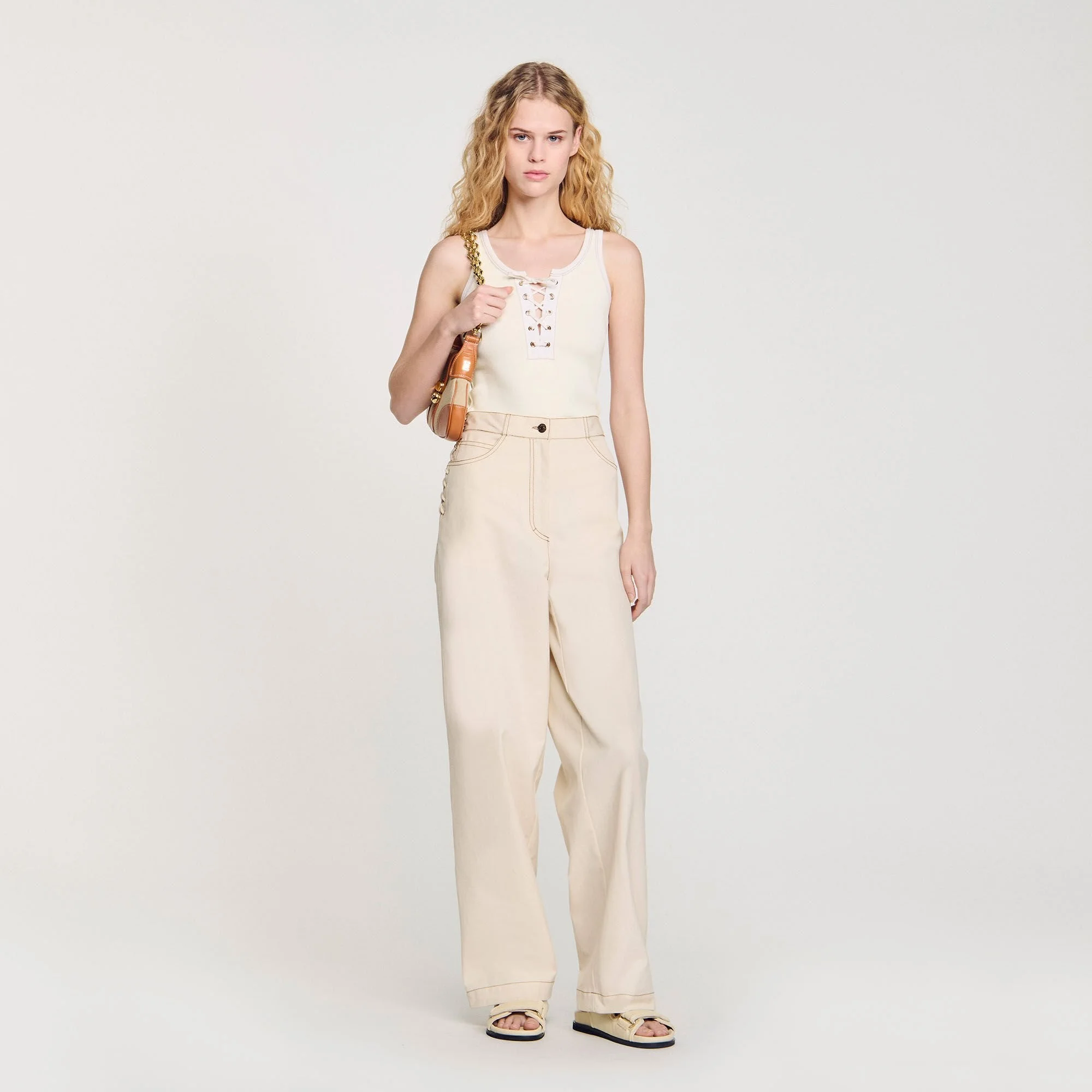 Ribbed vest top with round neckline and laced rivets. - Sandro Women's ribbed vest top - Round neck - Laced rivets - Contrasting topstitching - Designed for a slim-fit Reference: SFPTS01637_11 COMPOSITION & CARE Composition - Main fabric: 95% cotton, 5% elastane - Secondary fabric: 100% cotton - Rib: 97% cotton, 3% elastane Care advice - Gentle cycle 30° - Do not bleach - Do not tumble dry - Iron at a maximum temperature of 110°C without steam - Do not dry clean