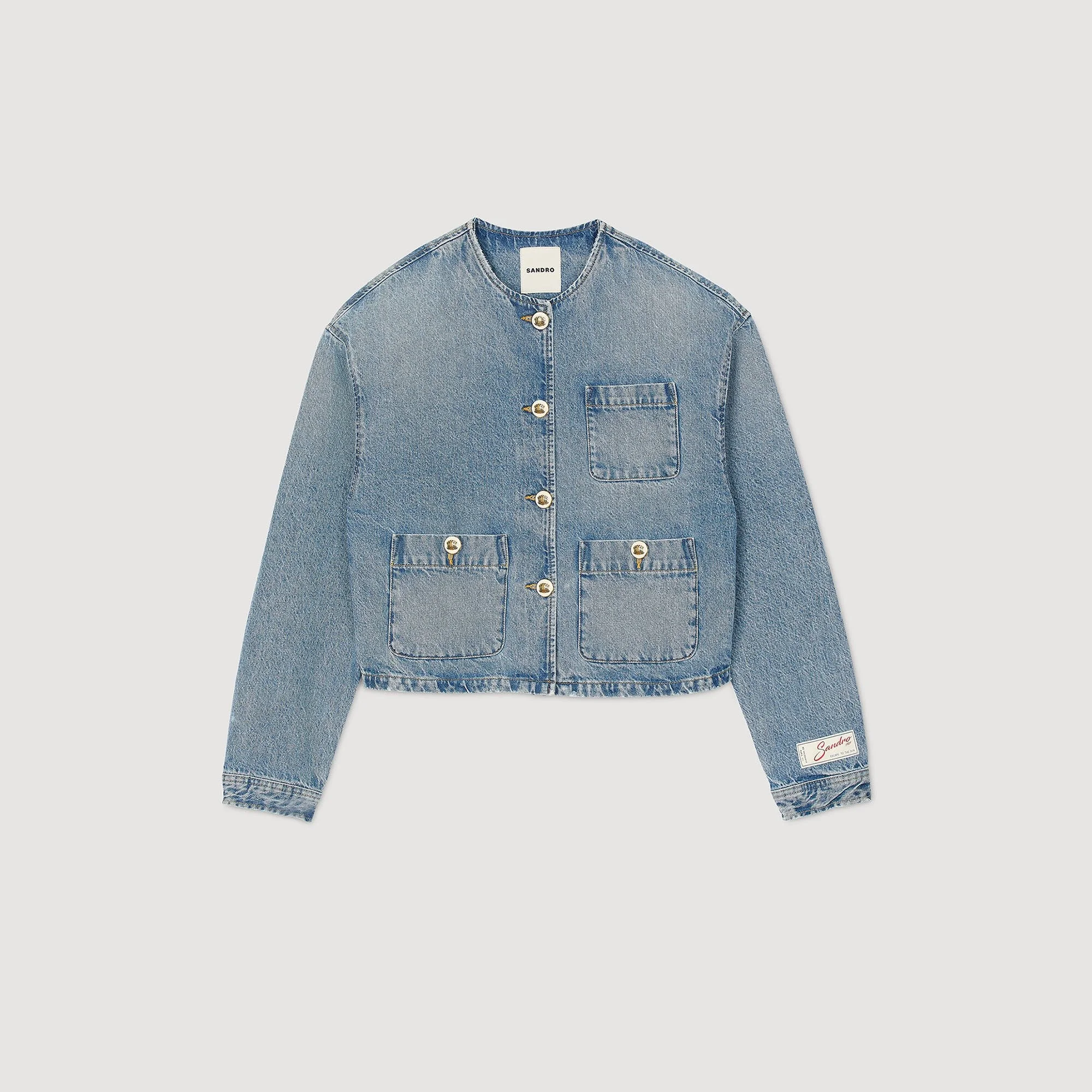 Faded denim jacket with round collar, long sleeves and decorative buttons on the placket. - Sandro Women's denim jacket - Round neck - Button placket - Long sleeves with button cuffs - Embroidered label on wrist - True to size This jacket matches and Reference: SFPBL01082_4785 COMPOSITION & CARE Composition - Main fabric: 100% cotton Care advice - Gentle cycle 30° - Do not bleach - Do not tumble dry - Iron at a maximum temperature of 110°C without steam - Do not dry clean