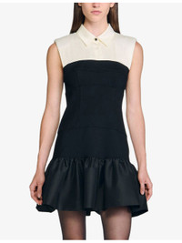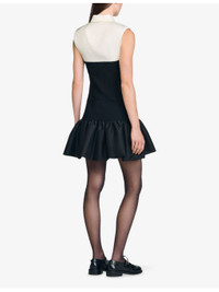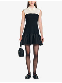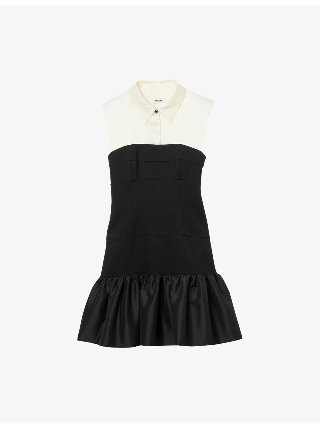PRODUCT DETAILS - Sandro woven dress - 100% polyester - Exposed button fastening at front - Slim fit, contrast collar, sleeveless, ruffle hem, two-tone design - Dry clean - True to size - Model is 5ft 9in/1.75m and wears a size UK 8 - Midweight, non-stretch Ref: R04501132