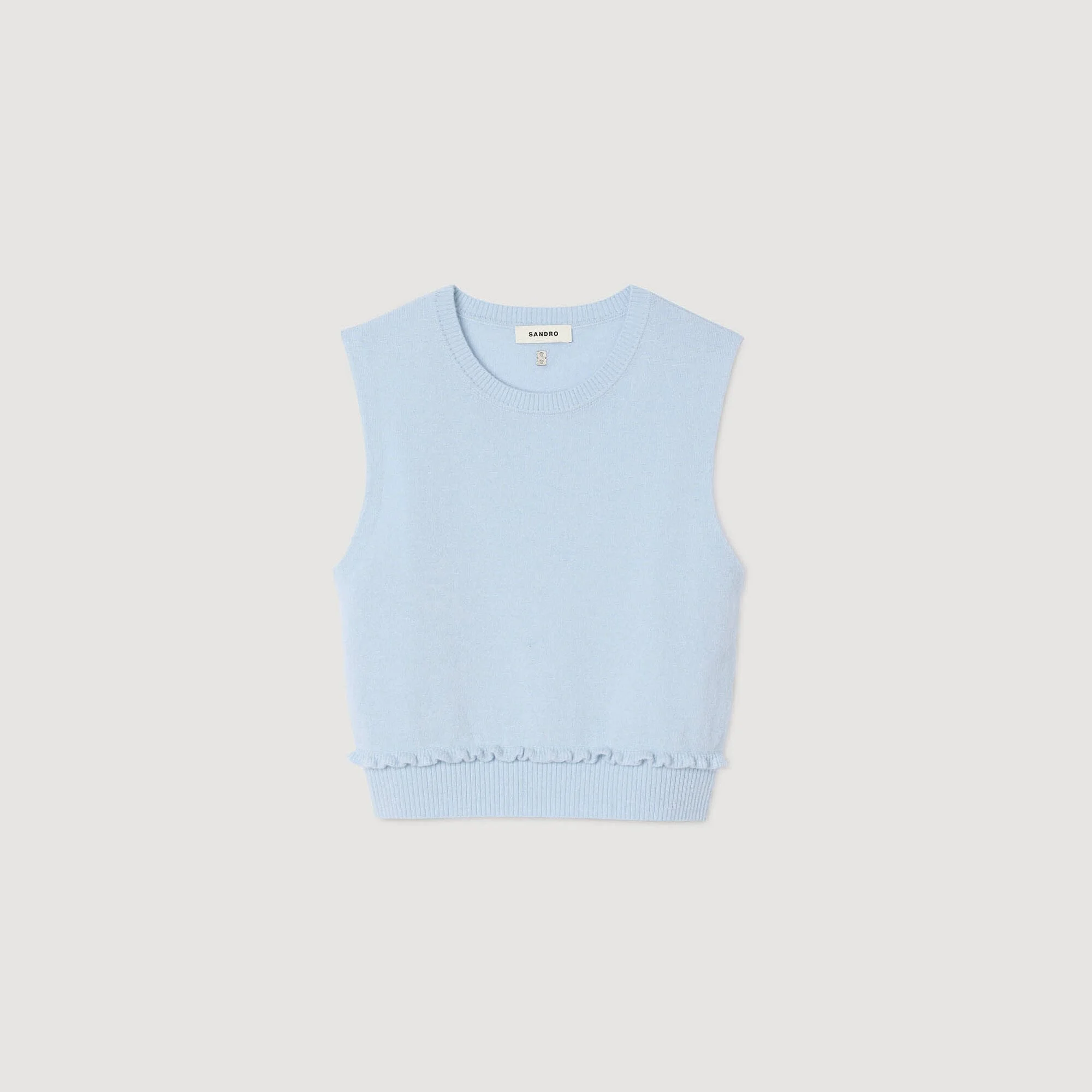 Sleeveless wool and cashmere cropped sweater with ruffle detail at the bottom and a Sandro tag on the chest. - Sandro Women's sweater - Wool and cashmere blend - Ruffled detail - SANDRO tag - Ribbed neck and waist - True to size These pants match the Reference: SFPPU02313_40 COMPOSITION & CARE Composition - Main fabric: 90% wool, 10% cashmere - Rib: 86% wool, 8% cashmere, 4% polyamide, 2% elastane Care advice - Hand wash - Do not bleach - Do not tumble dry - Iron at a maximum temperature of 110°C without steam - F/ - Professional dry clean, with hydrocarbon solvent, gentle treatment