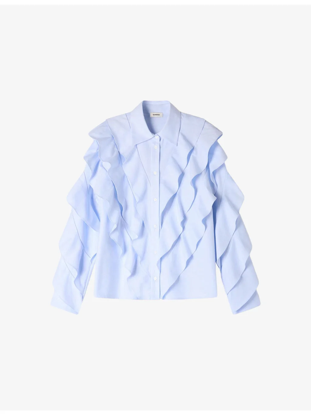 PRODUCT DETAILS - Sandro cotton shirt - 99% cotton, 1% elastane - Button fastening - Relaxed fit, collar, long sleeves, buttoned cuffs, all-over ruffles - Machine wash mild - True to size - Model is 5ft 9in/1.75m and wears a size UK 8 - Lightweight, non-stretch Ref: R04578657