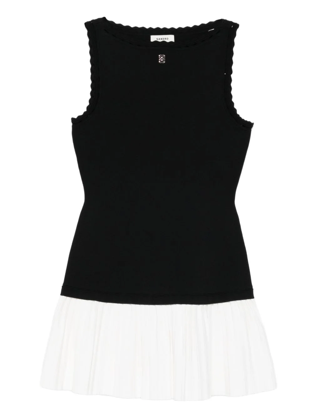 ruffled pleated midi dress Highlights - Black and white - Pleated skirt - Scalloped trim - Sleeveless Imported Composition Viscose 63%, Recycled Nylon 37% Washing instructions Read Manufacturer Guidelines