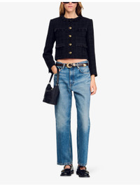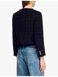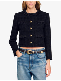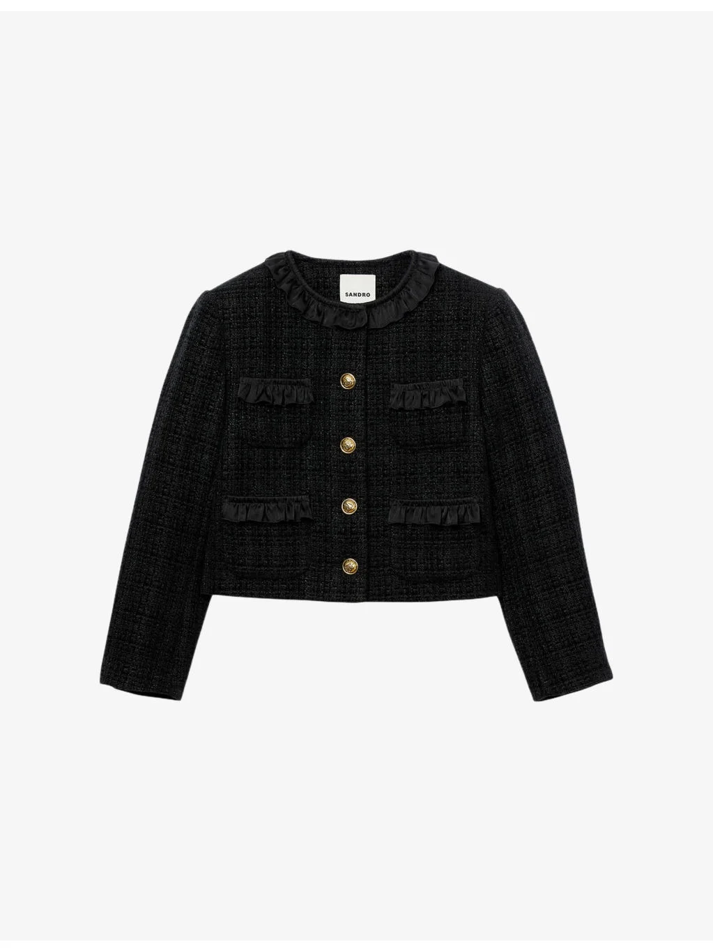 PRODUCT DETAILS - Sandro tweed jacket - 100% polyester - Exposed button fastening at front - Slim fit, round neck, two pockets at the chest and side, ruffled trim, gold-tone hardware, tweed finish - Dry clean - True to size - Model is 5ft 9in/1.75m and wears a size UK 8 - Midweight, non-stretch Ref: R04501230
