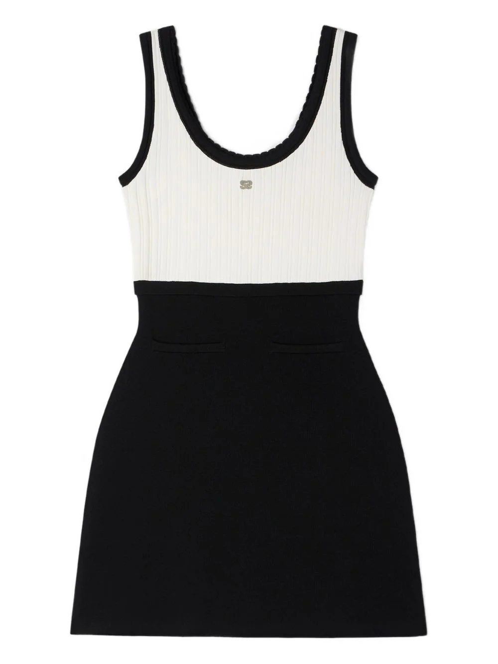 ruffled two-tone knit mini dress Highlights - Black and white - Two-tone design - Ruffled trim - Sleeveless - Two pockets - Fitted waist Imported Composition Viscose 53%, Polyamide 45%, Spandex/Elastane 2% Washing instructions Read Manufacturer Guidelines