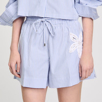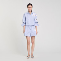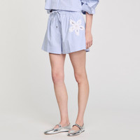 Striped shorts with elasticated tie waist and embroidered beaded and rhinestone flowers. - Sandro Women's striped shorts - Elasticated waist with ties - Floral embroidery with pearl beads and rhinestones - True to size Reference: SFPSH00449_40 COMPOSITION & CARE Composition - Main material: 97% cotton, 3% elastane Care advice - Hand wash - Do not bleach - Do not tumble dry - Iron at a maximum temperature of 110°C without steam - Do not dry clean
