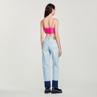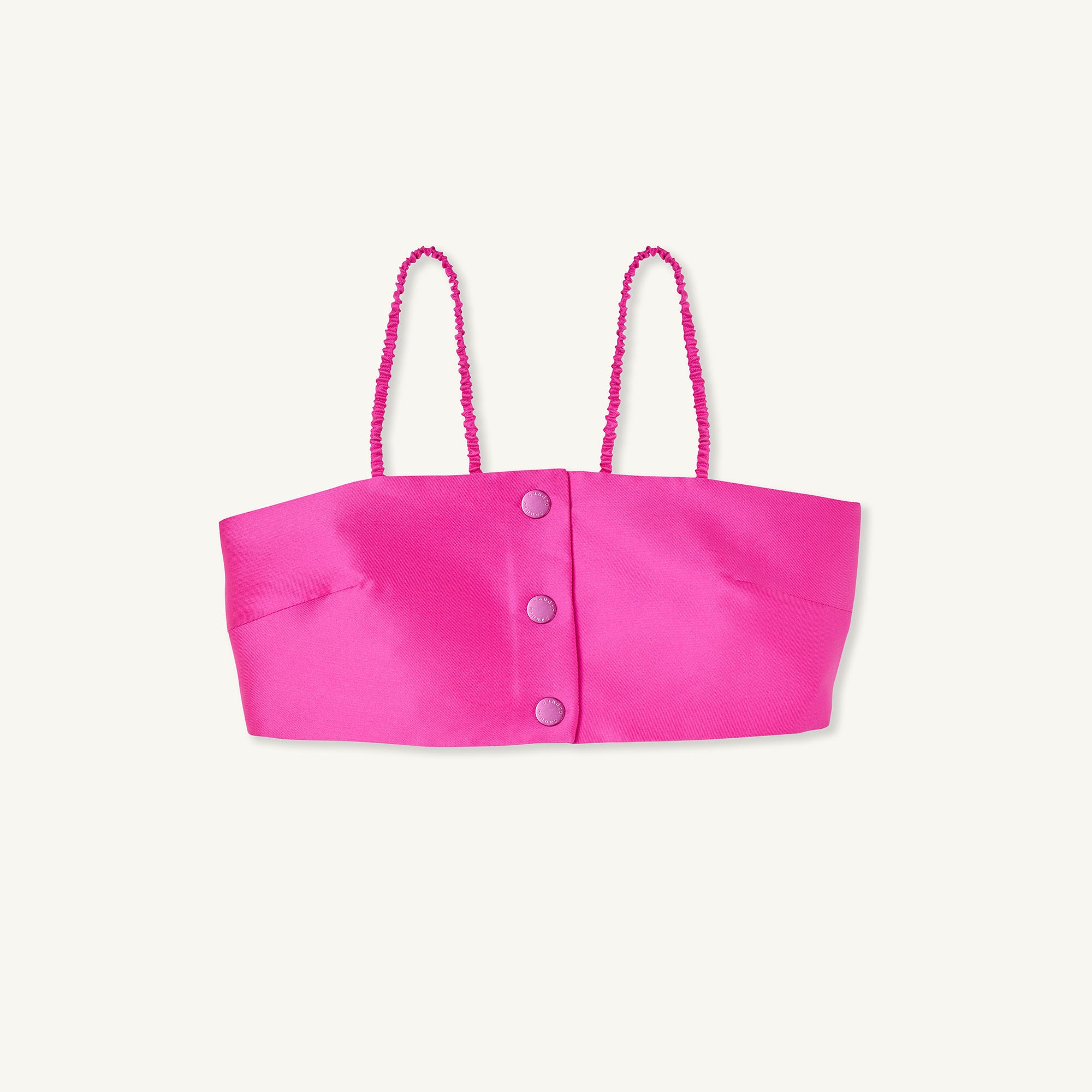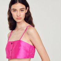Cropped bra top in a heavy satin featuring narrow elasticated straps, a smocked back panel and a front fastening with Sandro branded press studs. • Sandro Women's satin bra top • Narrow elasticated straps • Press studs • Smocked back This style is made from recycled material, limiting the effects on our environment and promoting a circular approach. Model is wearing a size 1 and is 179 cm tall Reference : SFPTO00530 MATERIALS Main fabric: 85% polyester, 15% silk