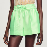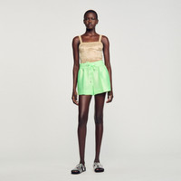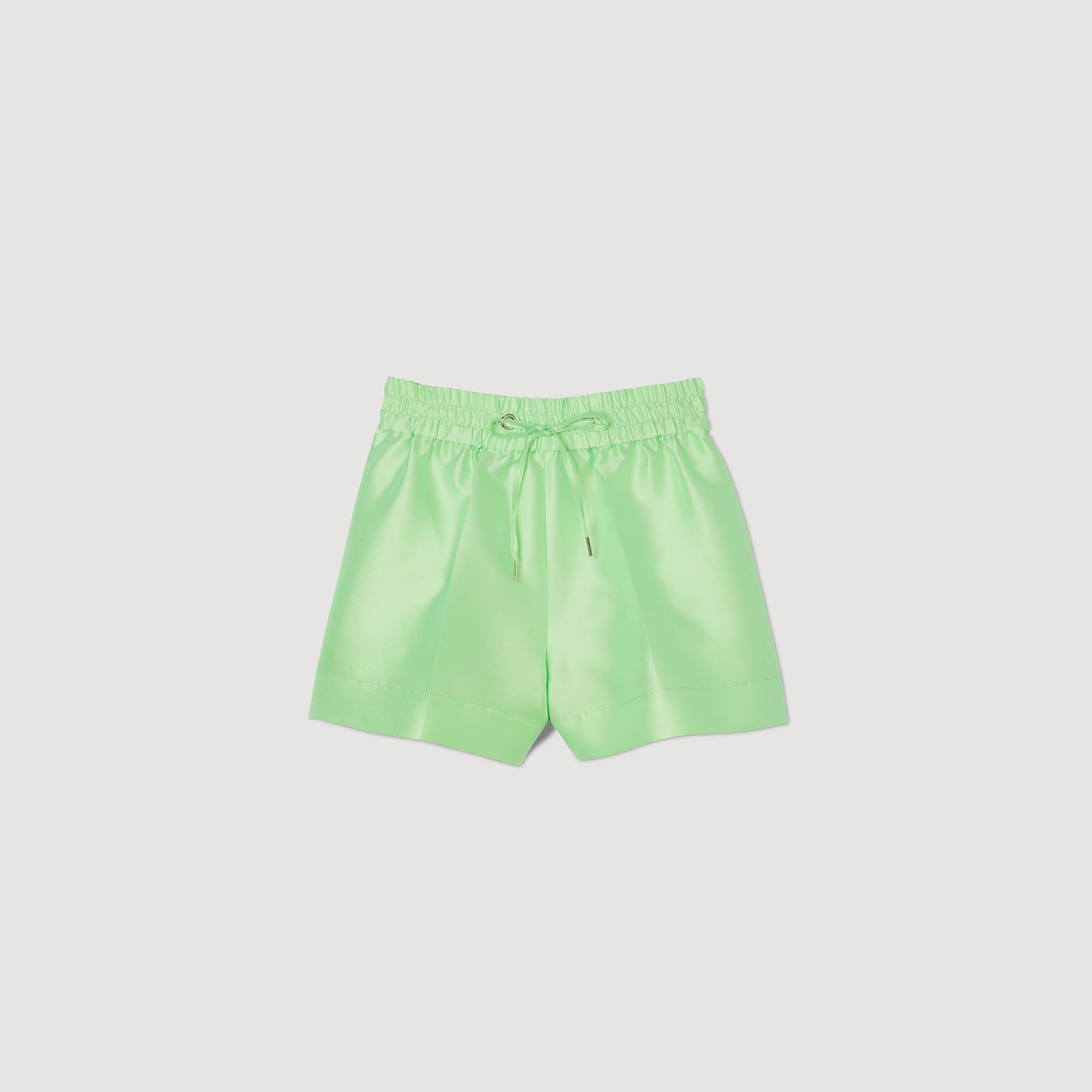 Satiny wide-leg shorts with a drawstring waist. • Sandro Women's satiny shorts • Drawstring waist • 2 pockets • Wide flared shape Model is wearing a size 36/UK 8/US 2-4 and measures 176 cm This item's main material is at least 50% recycled. Recycling reduces the environmental impact by limiting the use of virgin materials. These shorts have a matching shirt The model is 180 cm / 5'11 tall and wears a size 36 FR / 4 US COMPOSITION Main fabric: 85% polyester, 15% silk Reference: SFPSH00270_8032