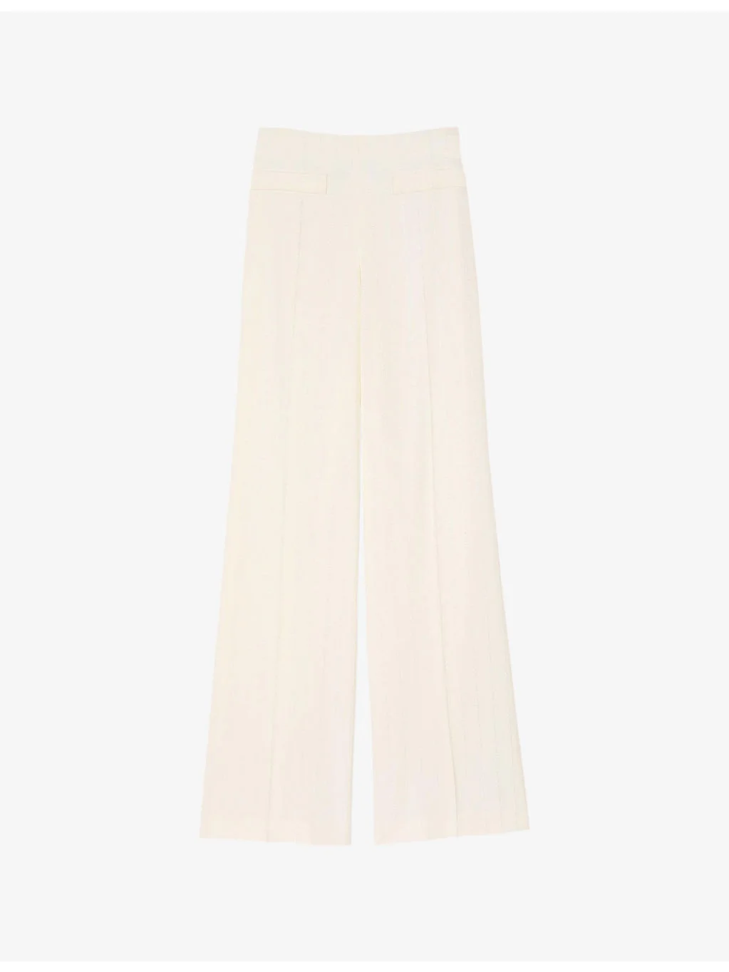 PRODUCT DETAILS - Sandro woven trousers - 95% viscose, 3% polyamide, 2% polyesterl; belt lining 100% cotton - Concealed zip fastening at side - Regular fit, high rise, straight leg, structured waistband, two front flap welt pockets, pressed creases, vertical stripes and tonal sequin embellishments - Specialist dry clean only - True to size - Midweight, non-stretch Ref: R04415601