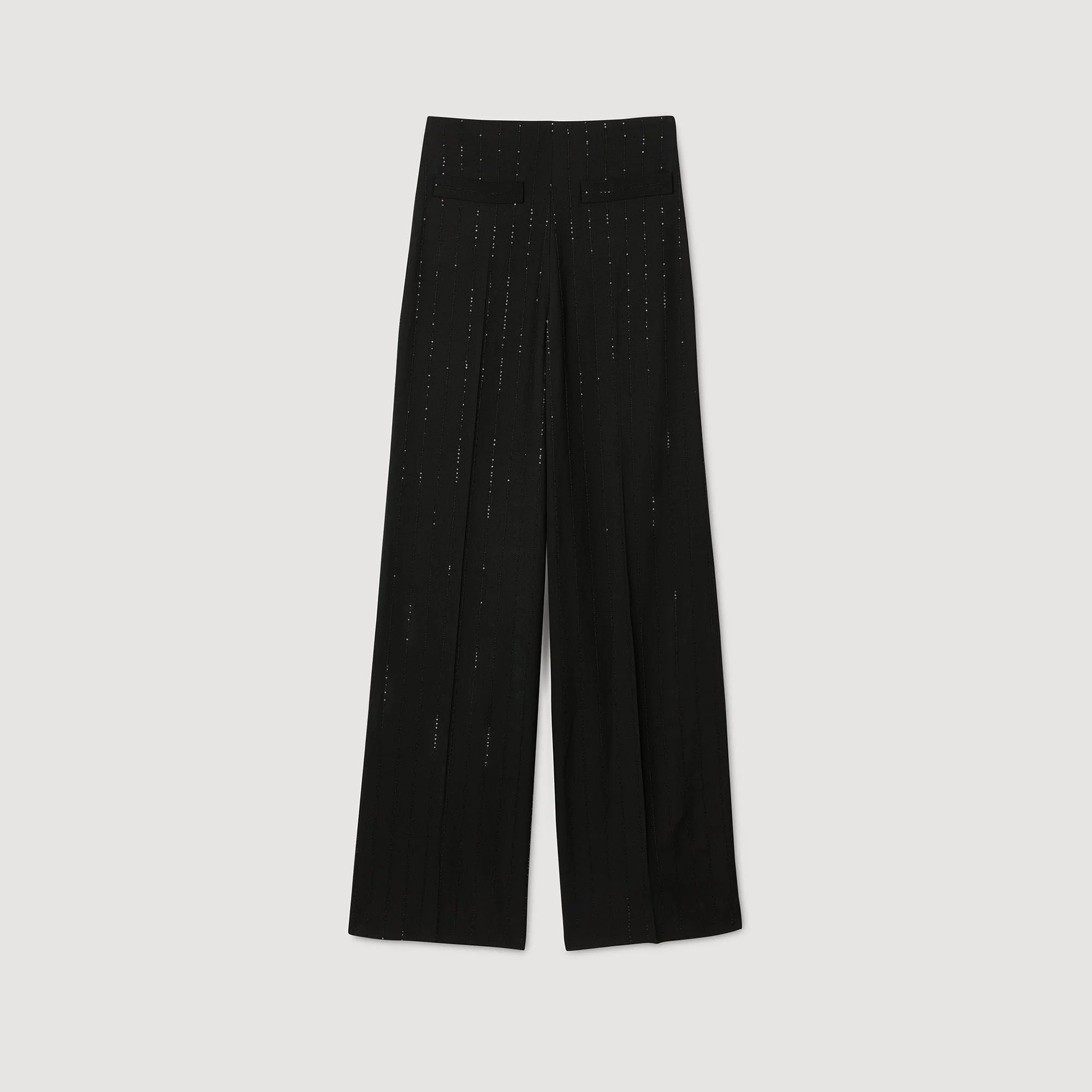 Straight-leg, high-waisted suit trousers with vertical stripes and tone-on-tone sequins and welt pockets on the front. - Sandro Women's suit trousers - Sequin stripes - 2 welt pockets - High rise - True to size These trousers match the and the Reference: SFPPA01680_20 COMPOSITION & CARE Composition - Main material: 98% viscose, 2% polyamide - Belt lining: 100% cotton Care advice - Do not wash - Do not bleach - Do not tumble dry - Iron at a maximum temperature of 110°C without steam - F/ - Professional dry clean, with hydrocarbon solvent, gentle treatment
