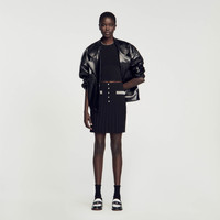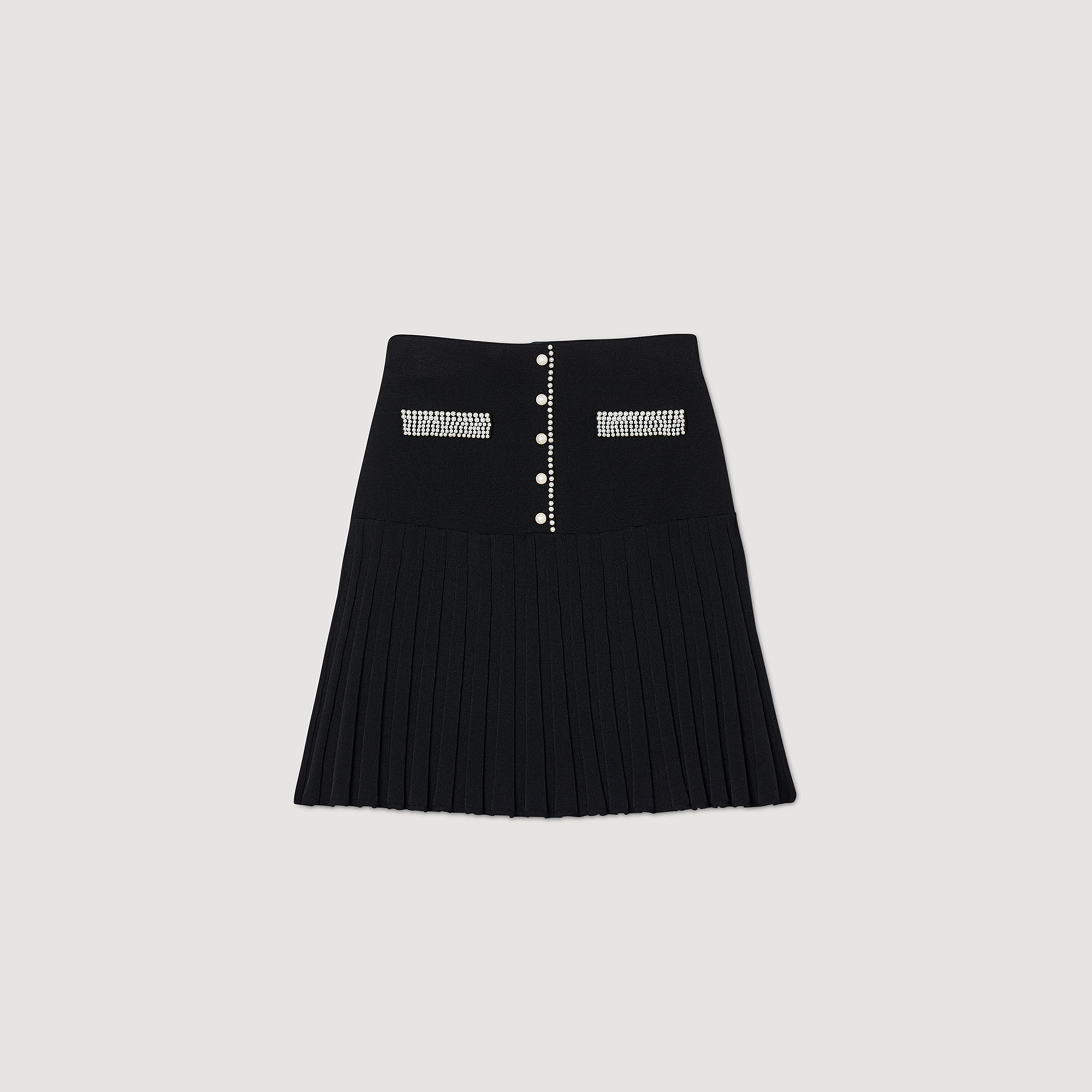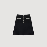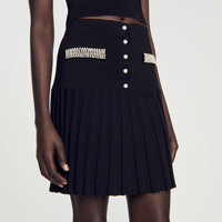 Short knit skirt with mock beaded buttons at the top and pleats at the bottom. Decorated with little beads on the pockets. Sandro Women's short knit skirt Pleats at the bottom Beaded buttons and beads on the pockets This skirt matches the cardigan and jumper Reference : SFPJU01017 MATERIALS Main fabric: 53% viscose, 45% polyamide, 2% elastane