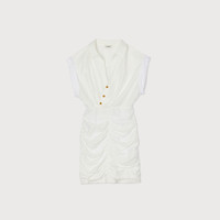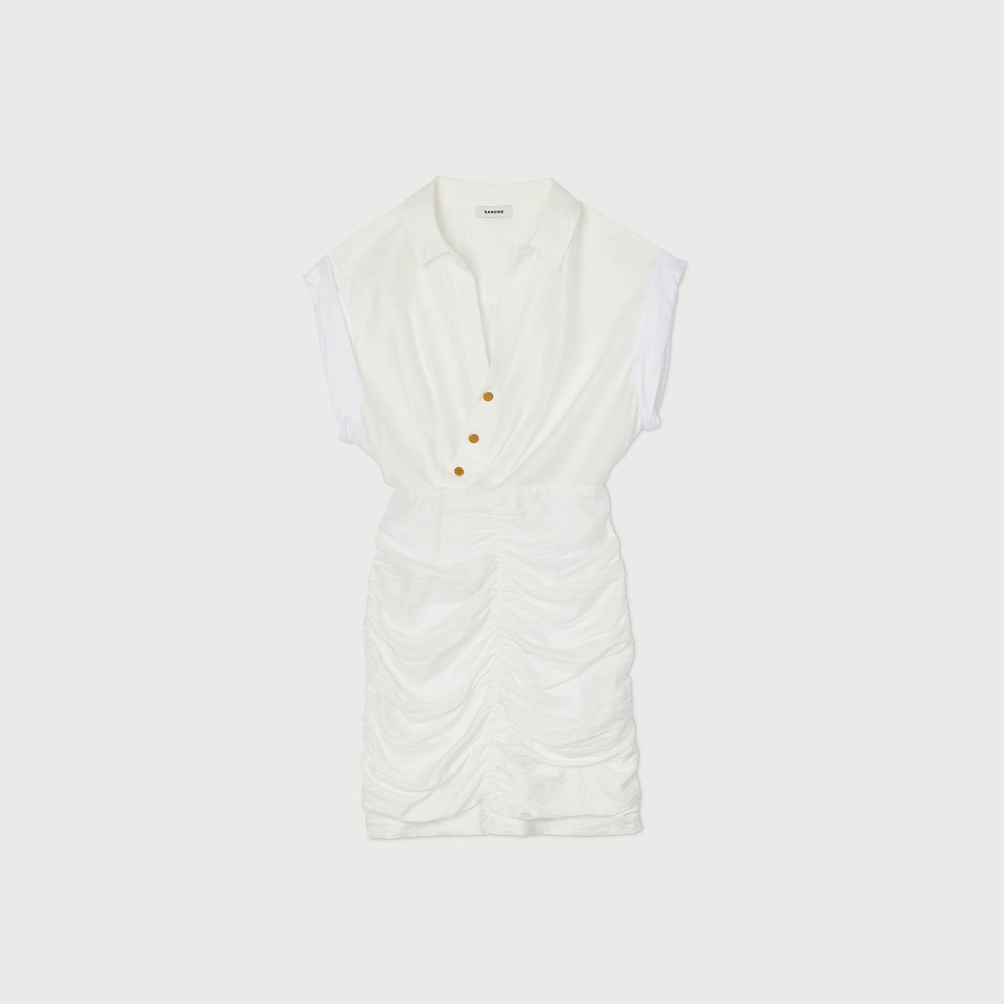 Short sleeveless linen blend dress with an open shirt collar with asymmetrical buttons and a close-fitting gathered skirt. Sandro Women's short linen blend dress Asymmetrical buttoned shirt collar Small lapels at the armholes Skirt draped close to the body The viscose contained in this style has a lower environmental impact than classic viscose. Its raw material comes from sustainably managed forests and its transformation into fibers is carried out via a process limiting impacts on the environment. Reference : SFPRO03529 MATERIALS Main fabric: 54% viscose, 32% linen, 14% polyamide Lining: 80% polyamide, 20% elastane