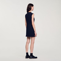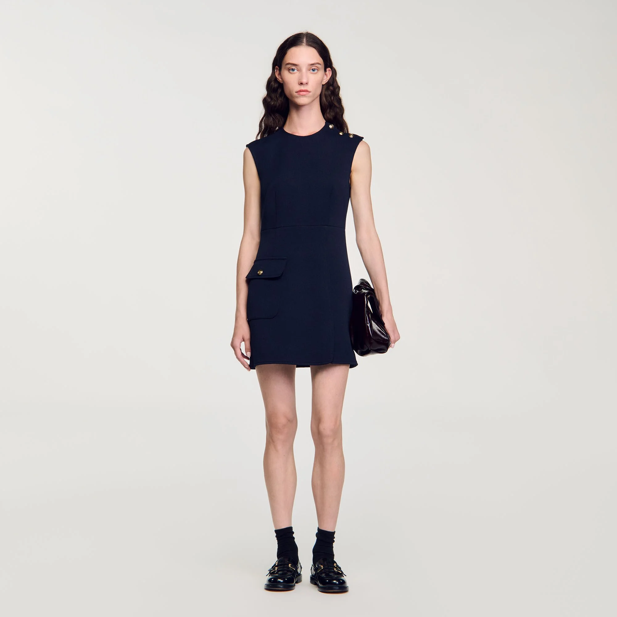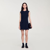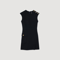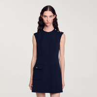 Short sleeveless dress in heavy crepe with round neck, XL patch pocket with flap, slit skirt and shoulder buttons. Sandro Women's short dress Buttons on shoulder Flap pocket on the side Front slit The model is 178 cm / 5'10 tall and wears a size 36 FR / 4 US COMPOSITION Main fabric: 93% polyester, 7% elastane Lining: 100% polyester Reference: SFPRO03902_44